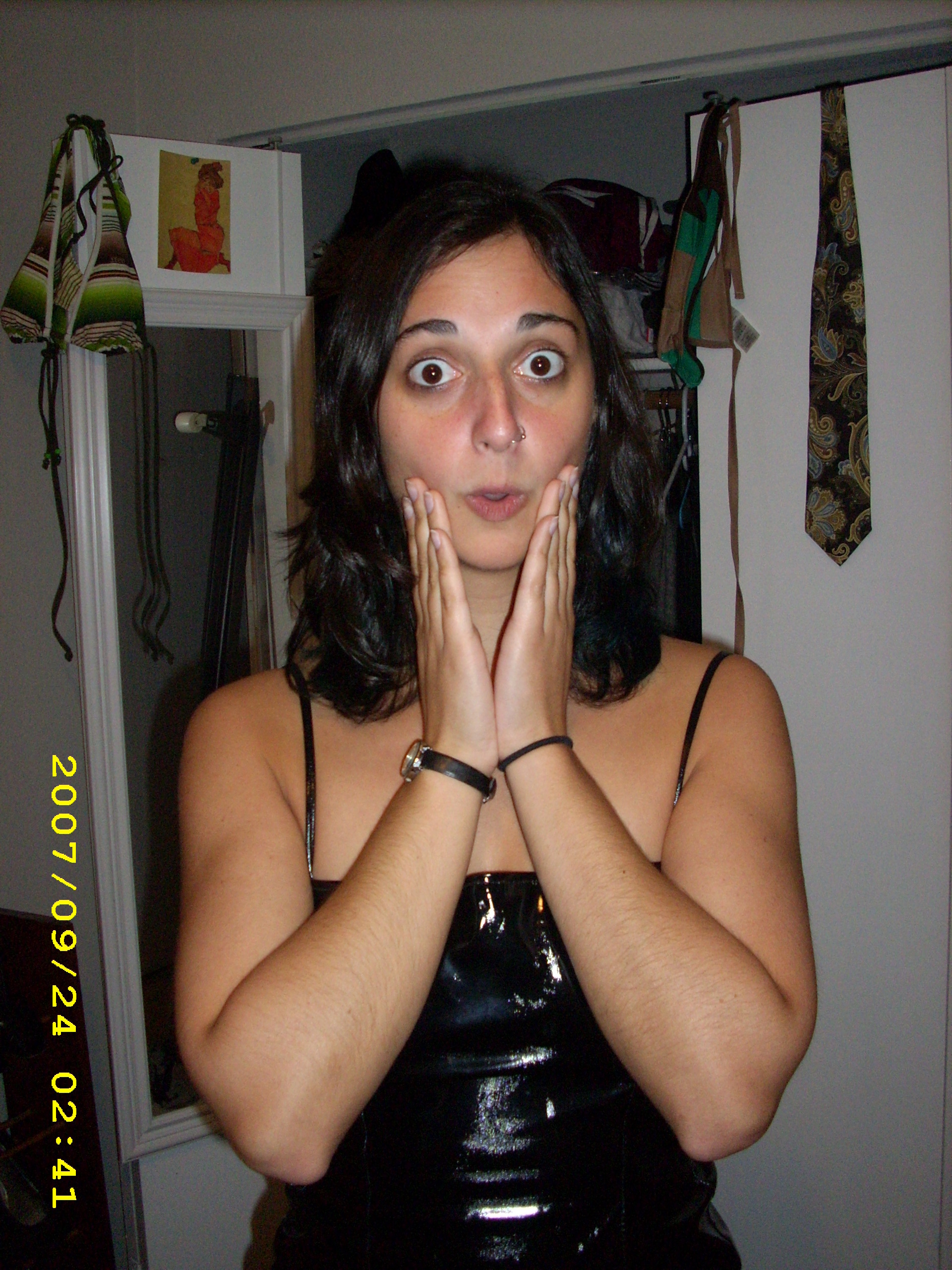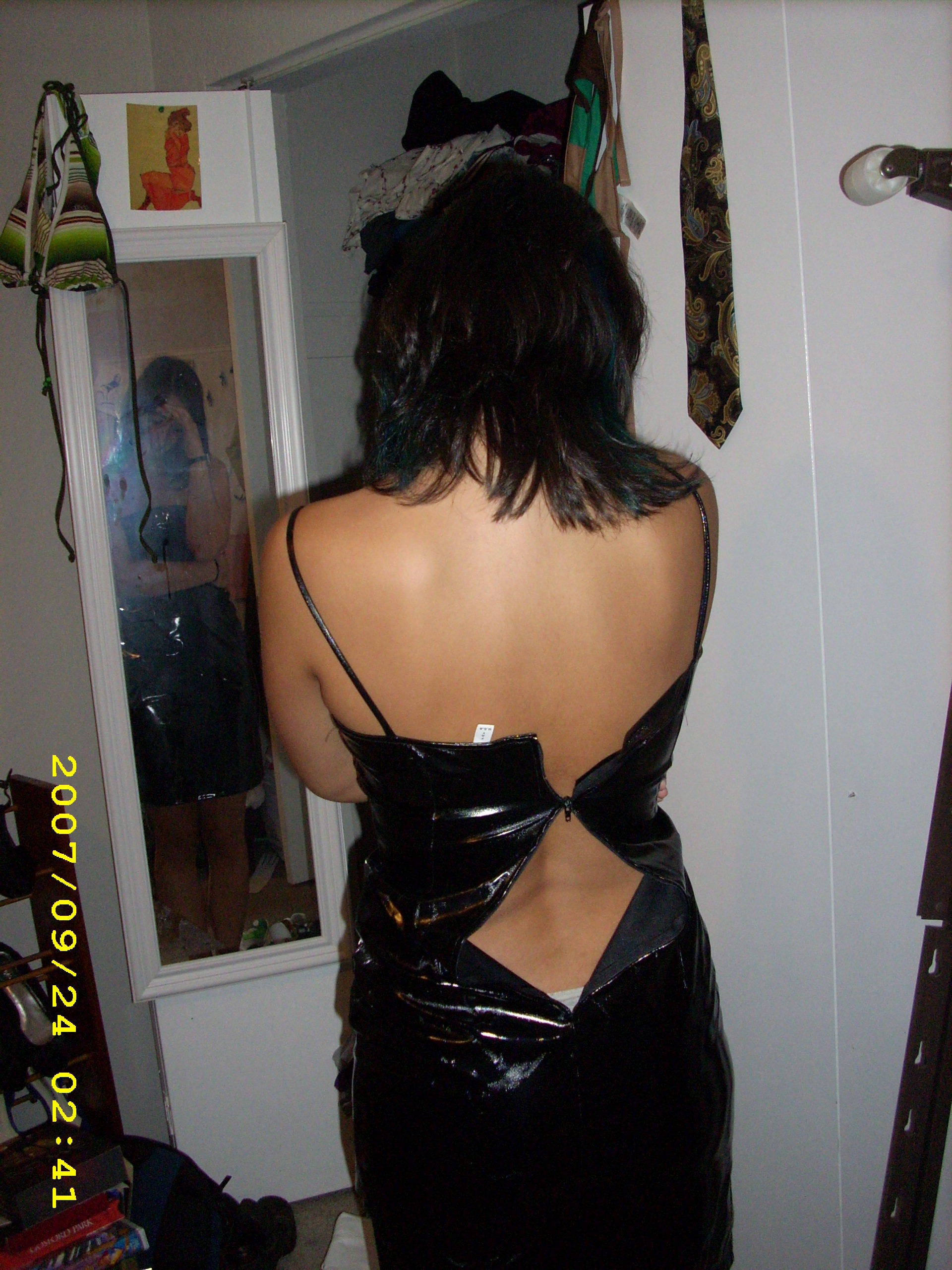 September 24th, 2007 11:48 AMThus began a glorious partnership. Scarlett wore her dress to dances at her academic (and corrupting) summer camp. She incorporated it into the best Halloween costume ever, accessorizing it with sh*t-kicking boots, spiderweb thigh-highs, black trench coat and suberbly ghoulish The Crow makeup (duly frightening her Pre-Calc teacher, and probably some little freshmen as well). Off went Scarlett to college with her shiny dress in tow. Though no longer a gothling, she relished the chance to get all sexied up in a costume that was supposed to represent Sinfulness (see picture 1).