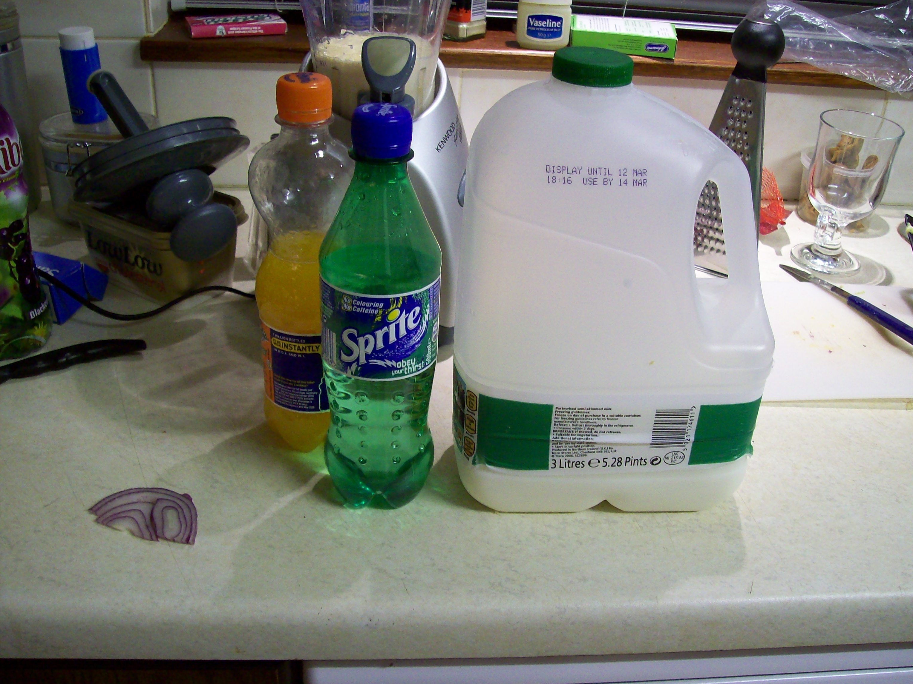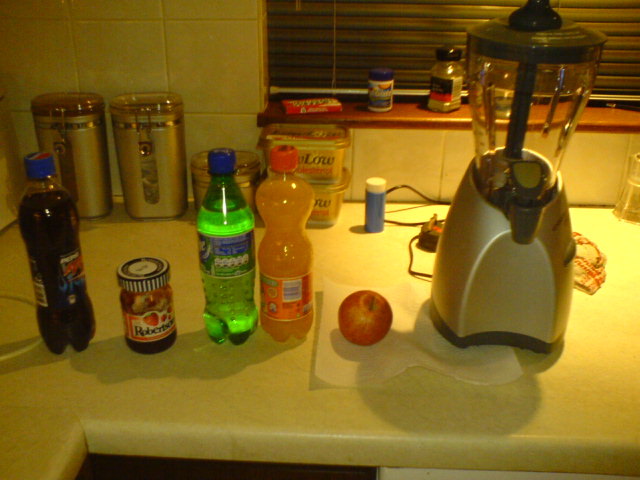 These were the ingredients I used for my drink Sprite/Lemon and Lime. Fanta/Orange 100ml. Strawberry jam - 2 dolops/a tablespoonful. Half an apple