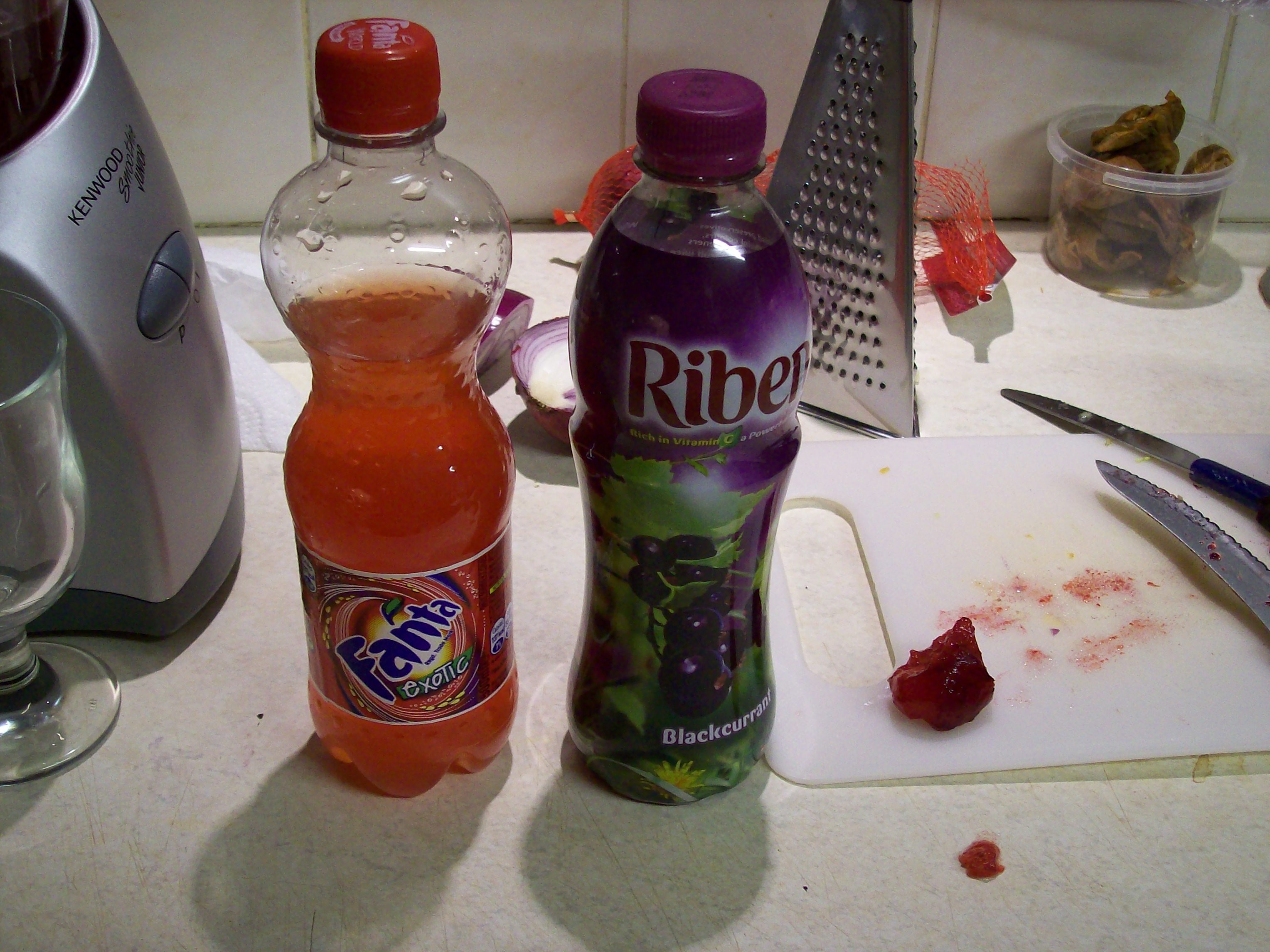 This was the finished drink. I liked how it had 3 different layers in it. The ingredients were: Half a plum. 100ml of Ribena/Blackcurrent juice. 100ml of Fanta exotic.