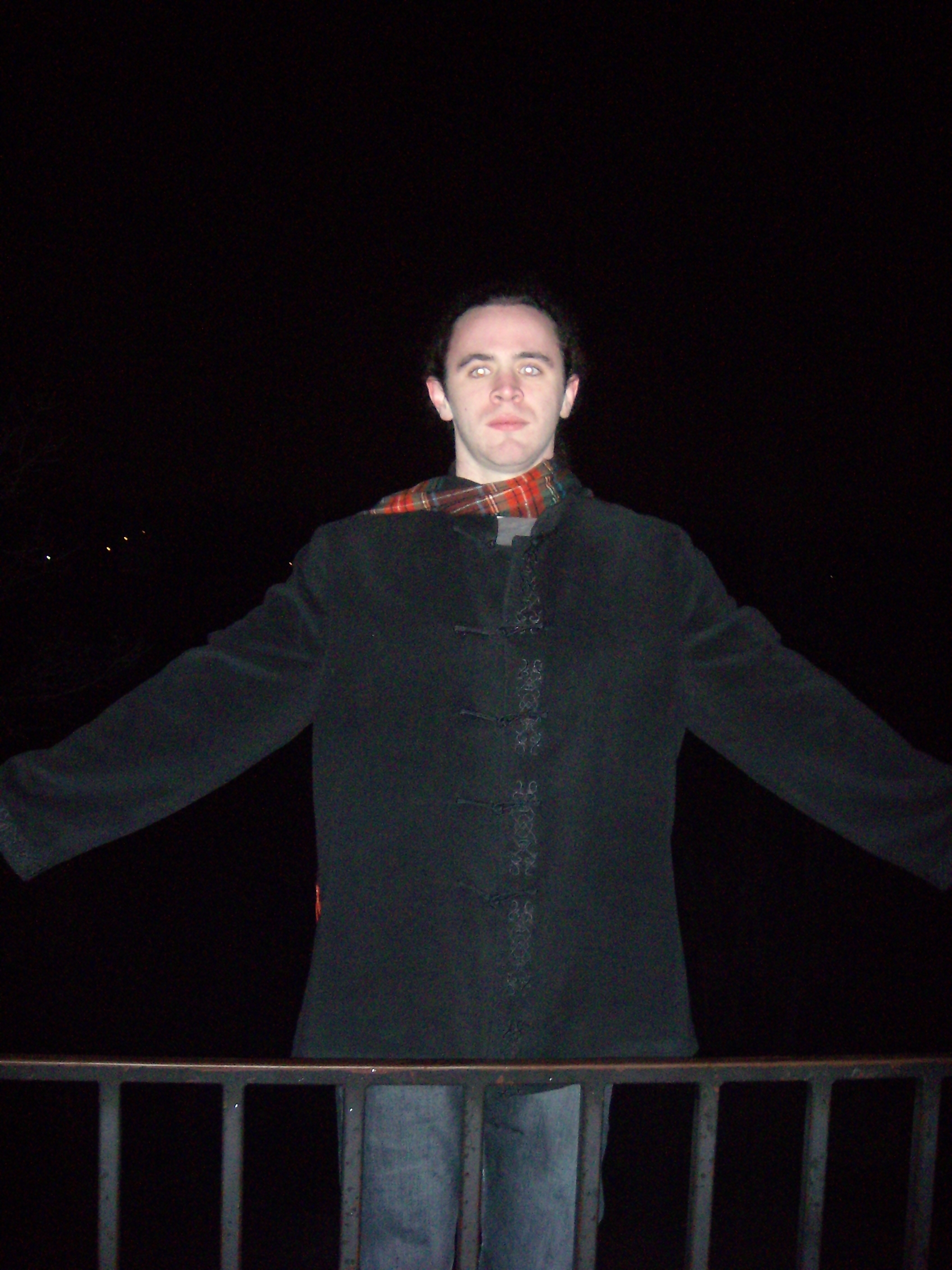 So, I walked down to a park on a river near where I live. I decided to take my picture as I leaned backwards on the wrong side of the railing. What you can't see due to the darkness is the large river that is running behind me. I like how my eyes turned out. I even manged not to fall backwards and hurt myself. Yay!
