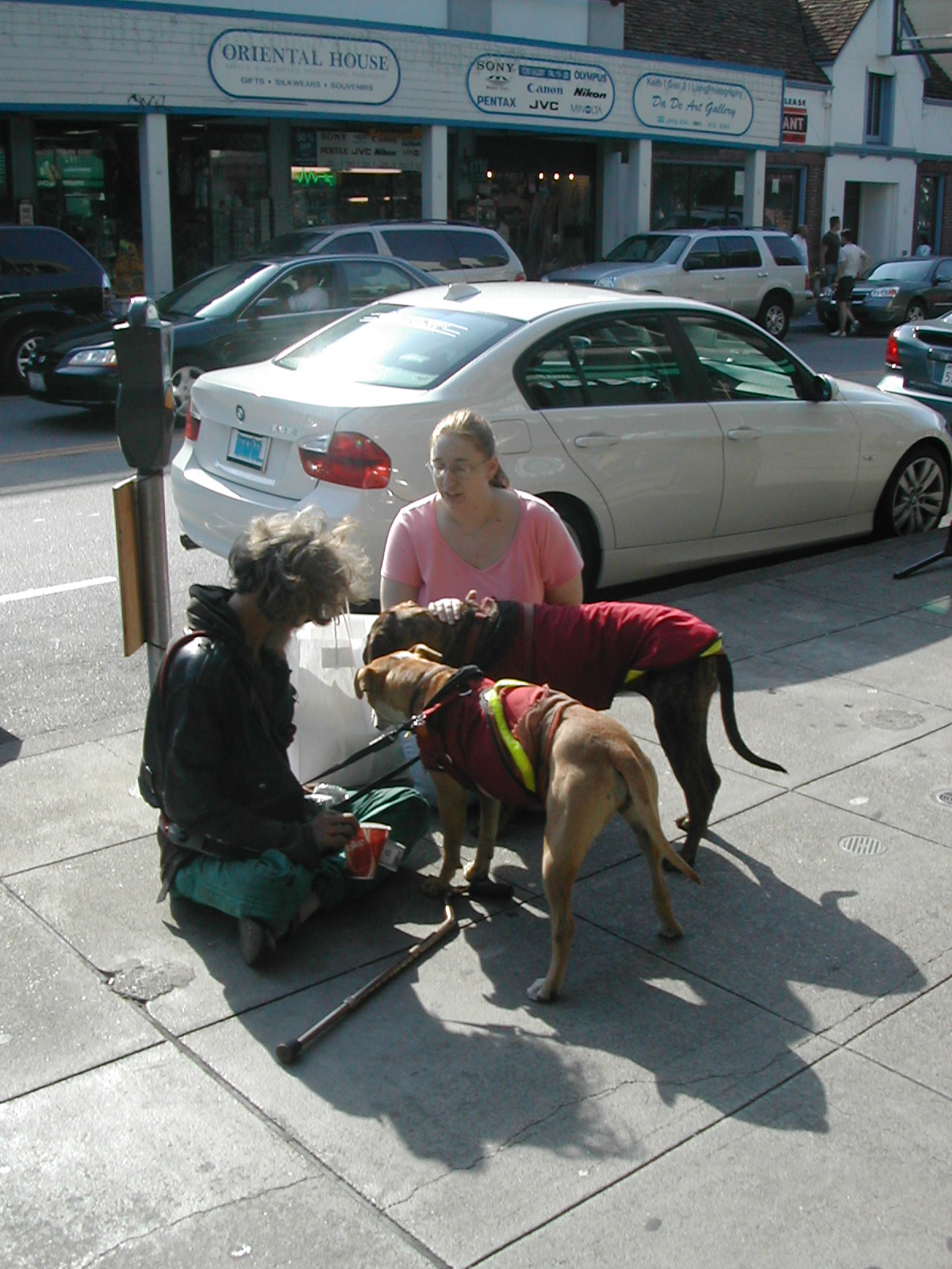 The next person I encountered was Jerry and his two dogs. One was named Trixie, but now I can't remember the other's name. Jerry and his dogs were very friendly. I sat and chatted with him for a bit, and also got my photo taken with him. He enjoyed talking about his dogs and interacting with them, and I got the definite sense that they were a good part of what kept him sane and happy living on the streets. I gave him two energy bars, and then two more for a friend of his that he mentioned. I wanted to talk with him some more, but the crowds were a bit much that day, so we gave each other a "Namaste" good-bye and went on our way. Ten steps later I realized I'd forgotten his name. I turned back and trotted closer to ask, but I scared his dog, who barked, who in turn scared some little kid into crying. Man, I felt like a total heel after that.