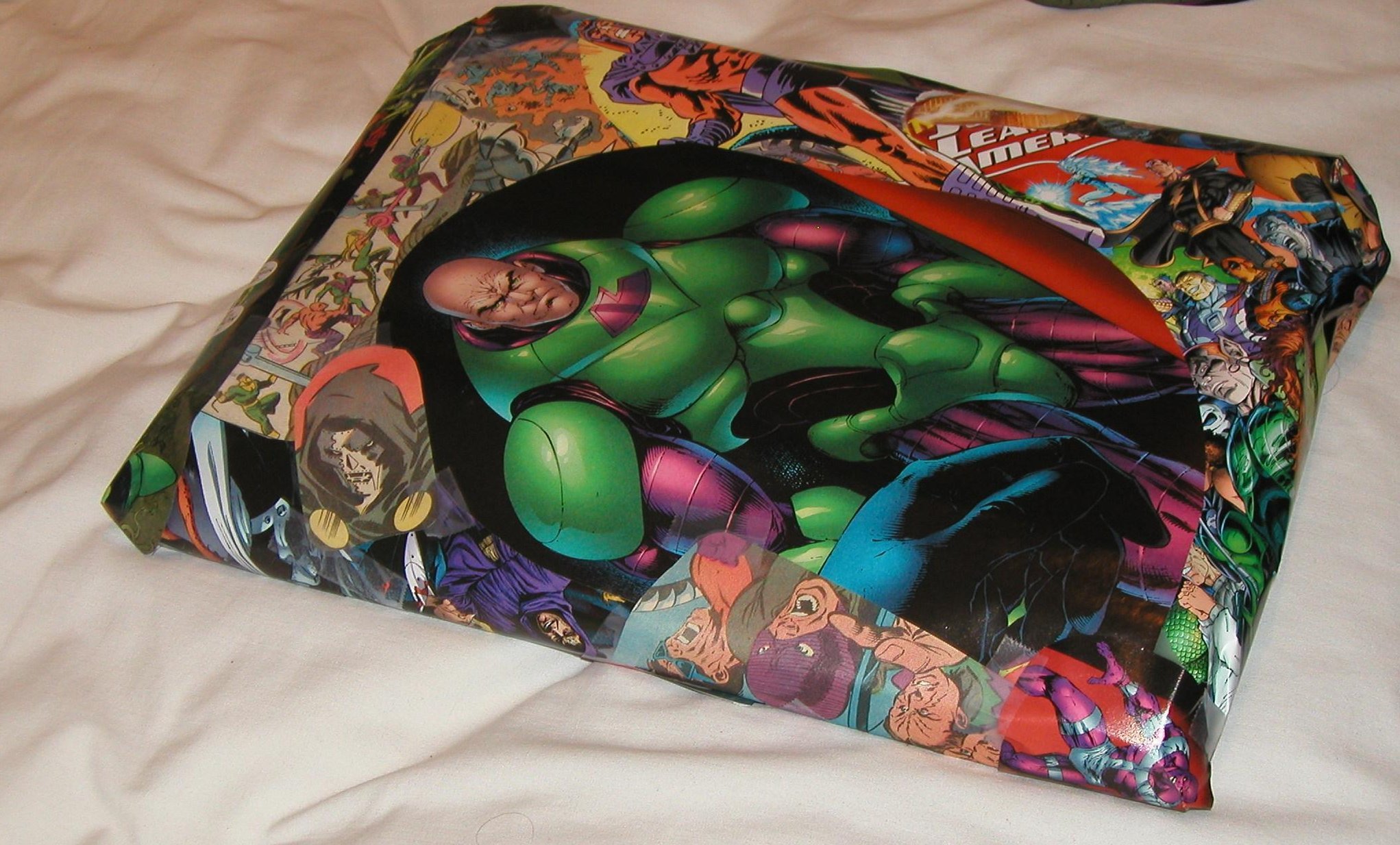 The wrapping for this was crucial, and I think came out really well. It's made from a collection of supervillains (Lex Luthor gets top billing of course, but Doctor Doom, the Joker, Magneto, and many, many others also appeared). These were taken from actual comics (cutting up the comic books might have been the hardest part for me to do) and taped together to create the wrapping paper. I really like the look of it.