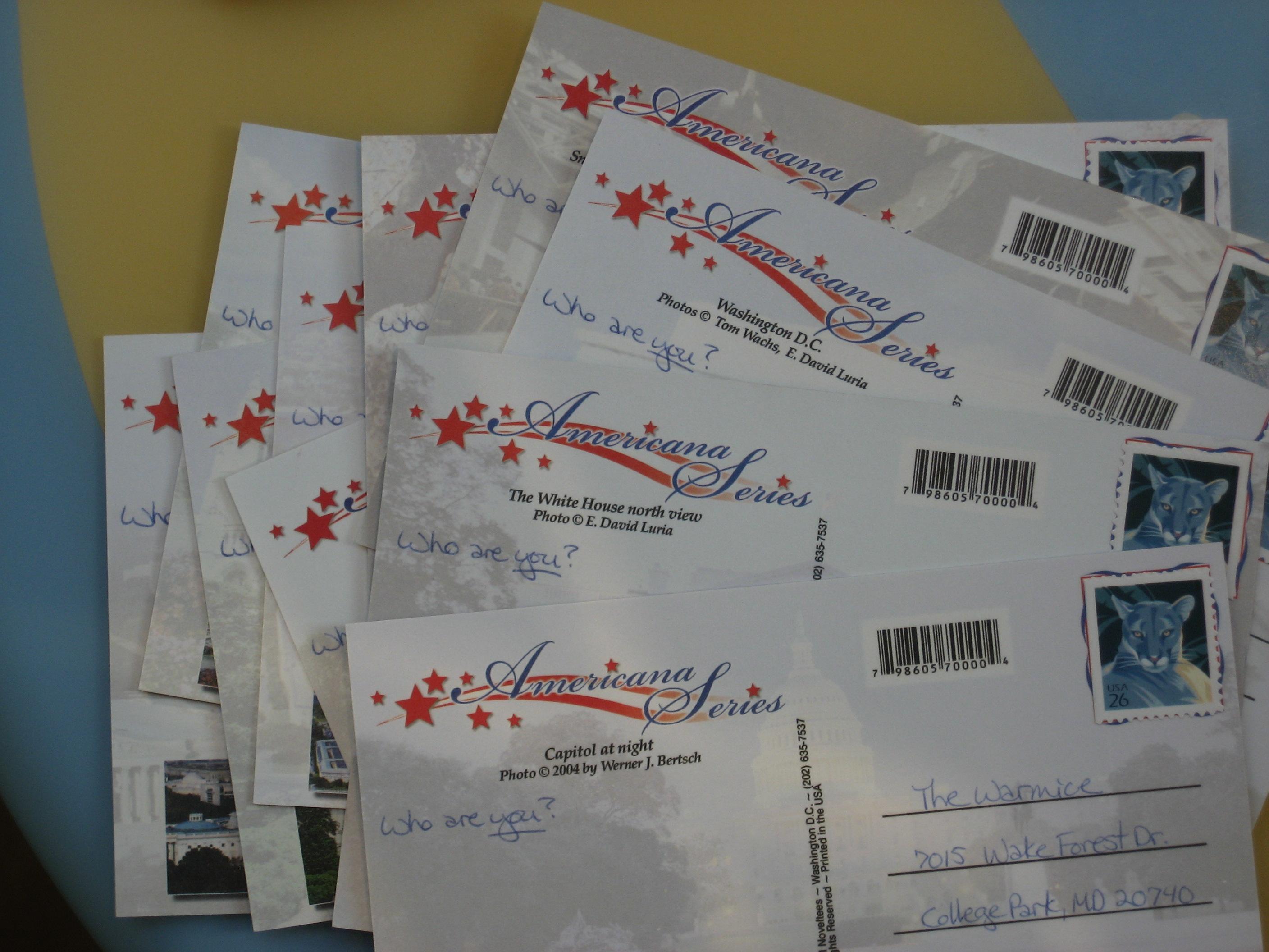In any case, the three filled-out "Who are you?" postcards were each interesting, and a real treat to receive. Great task!