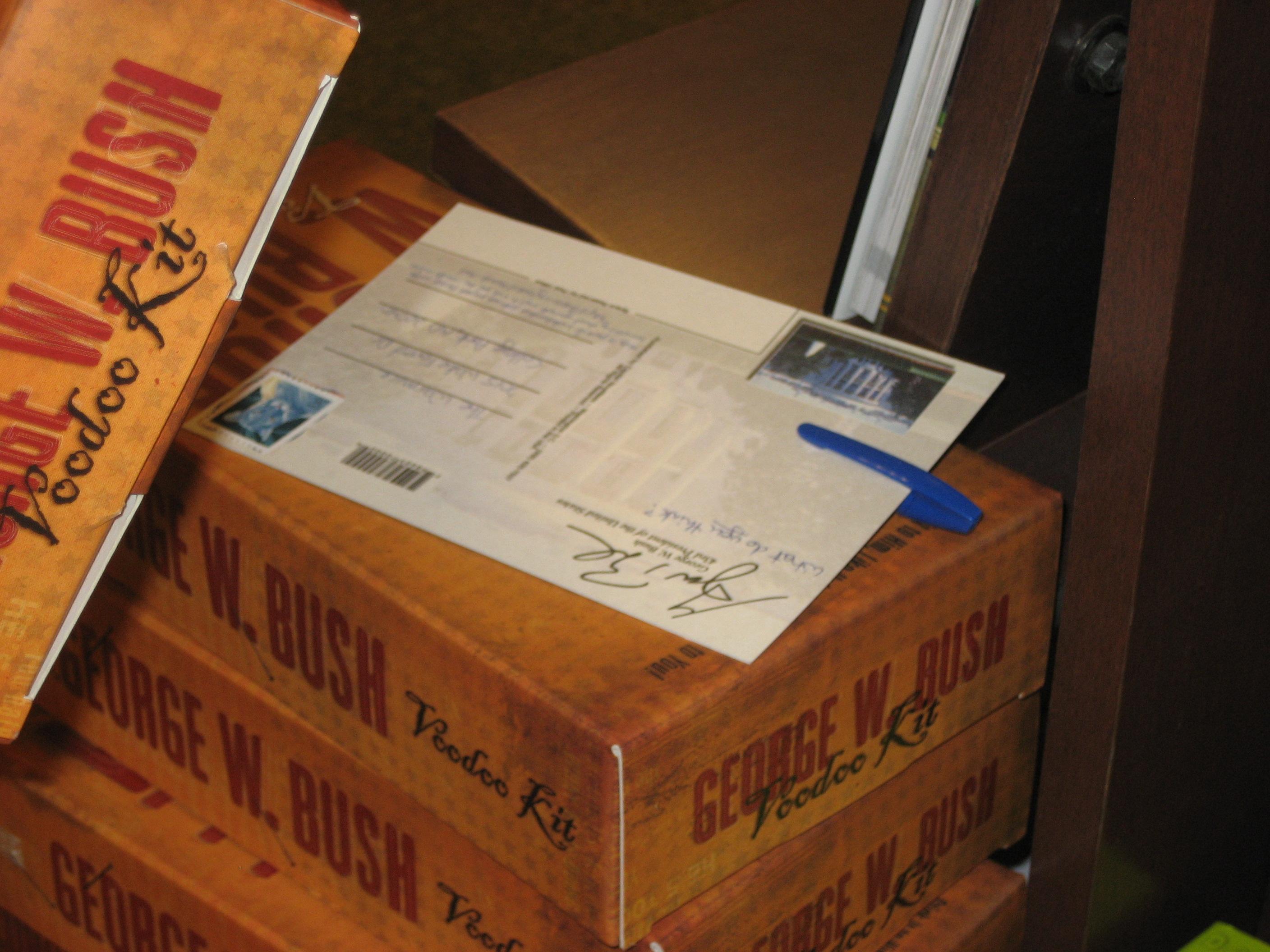 A Bush postcard, left in FedEx. We tried to be subtle in placing postcards, but the FedEx guy had his eye on us.