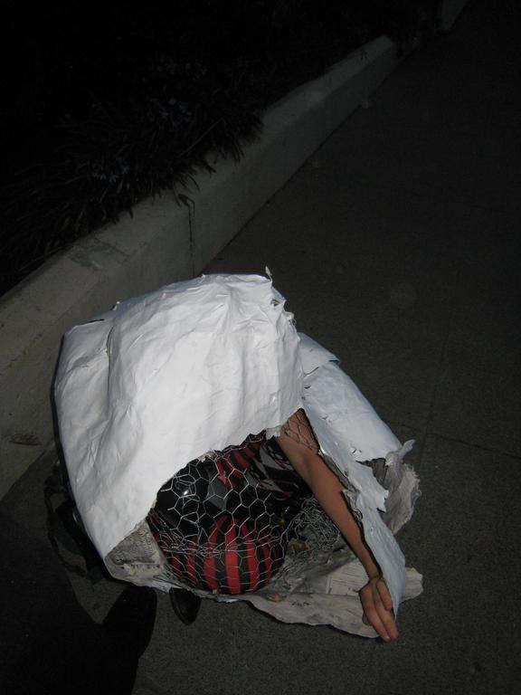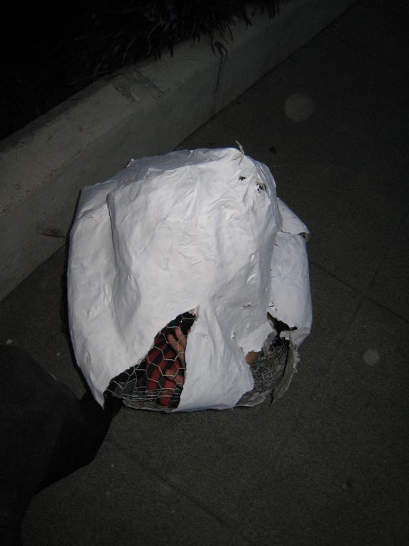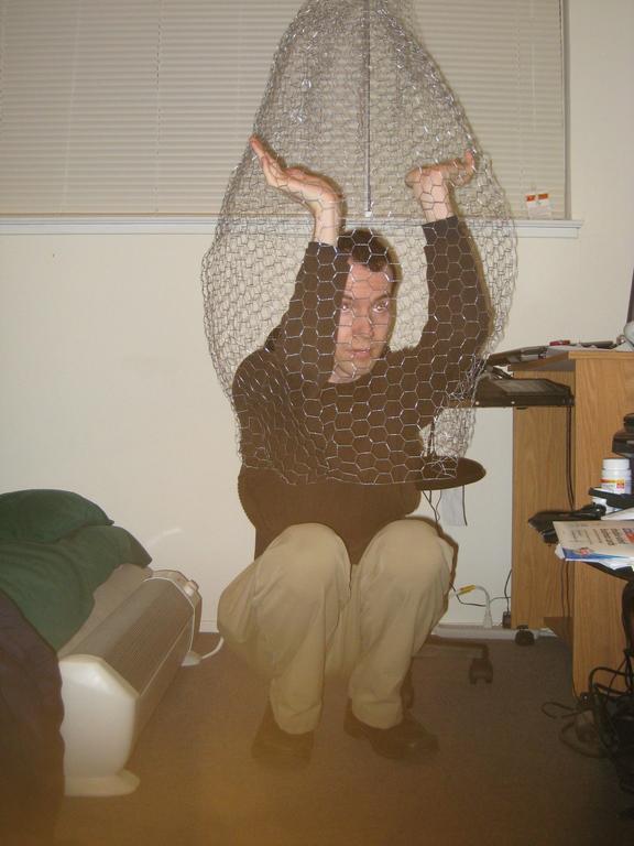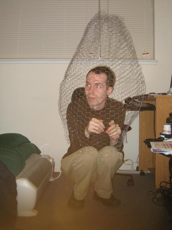 Armed only with a wire cutter and a will to live, the actual hatching was amazingly difficult. Spidere did a fantastic job creating the egg (thanks Spidey!), but having never met me before, he made it a tad too small so it was difficult to fit in there in the first place. also, bear in mind that i was single handed and left handed. so attempting to force my way out through chicken wire and paper mache was really quite hard. Spidere had thoughtfully built in several splits in the chicken wire with the idea that i could punch them outwards. but that didn't turn out to work all that well.. i only had a range of motion of about 4 inches directly in front of my face. so i painstakingly and painfully cut all the chicken wire in that 4 inch box and bent it back so i could access some part of the paper mache (in the video you see me then poke an air/peeking hole. after that i gave up on cutting (not really feasible left handed). so brute force it was. I made it out, but not without numerous cuts. (but as we all know Time and Medical attention heals all wounds). Also, in case it wasn't clear from the video, Spidere and I were in the midst of Don't Ever Let Go, so had to maintain contact throughout with our toesies.
