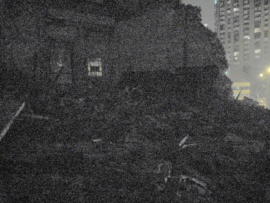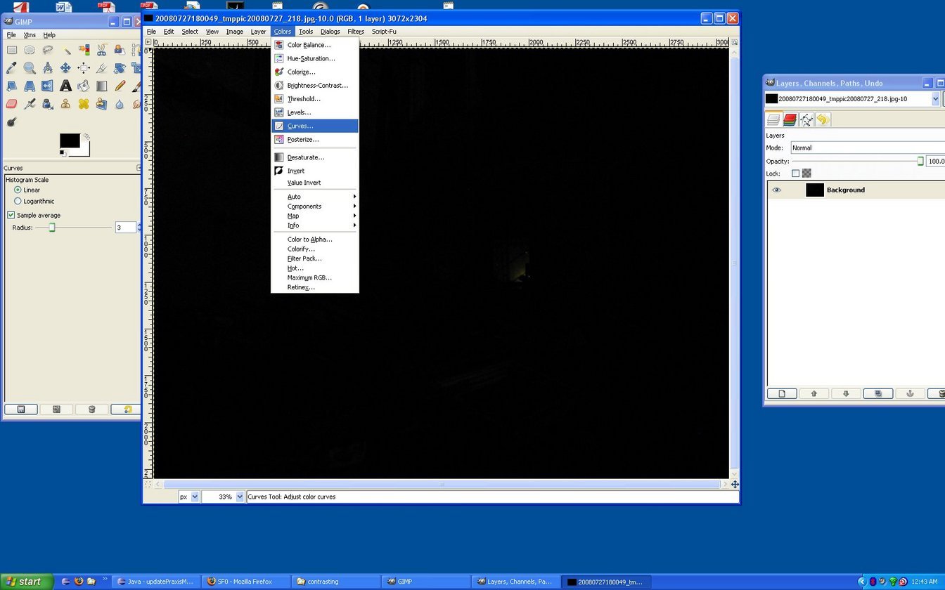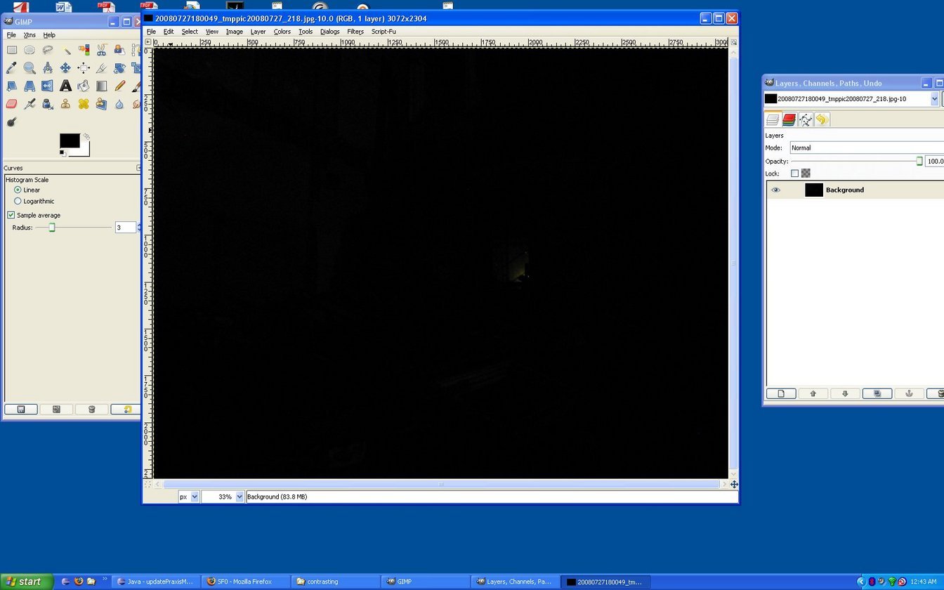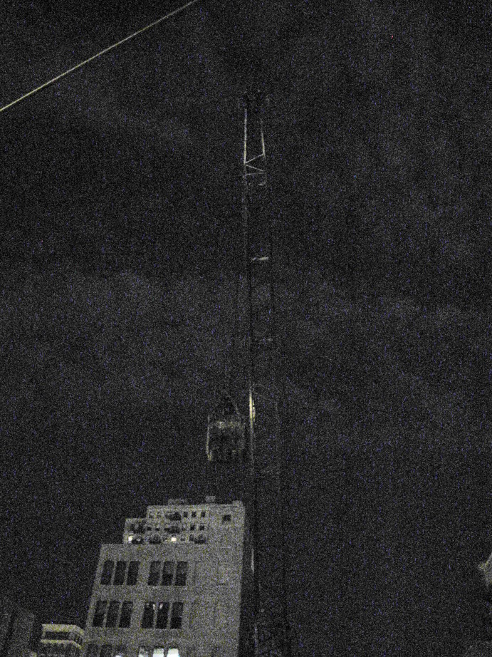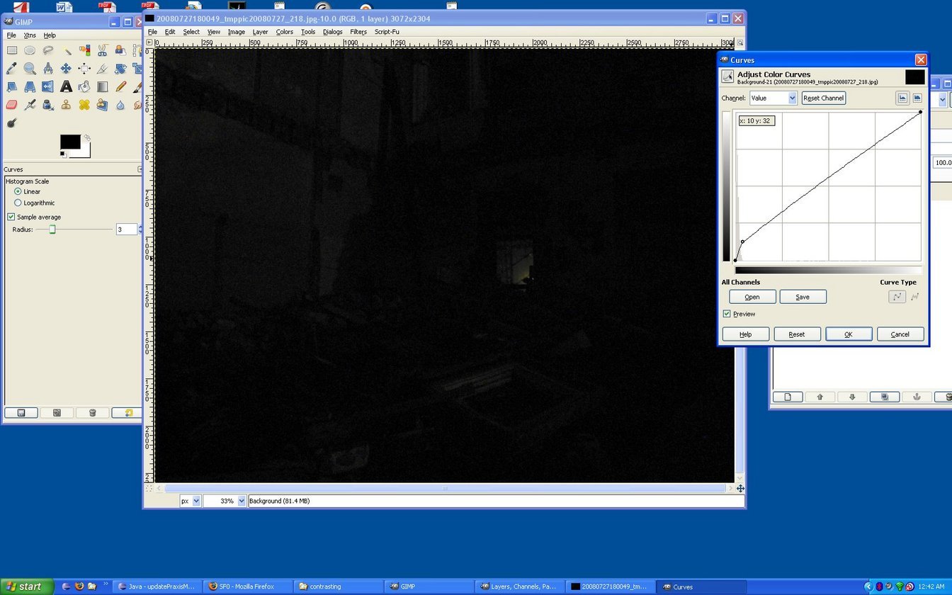 GIMP is really an amazing tool--I used the curves function to try to drive more contrast out of the pictures. A lot of the time, with night photos like this, you just end up with grainy black/white/gray pictures--there's not that much information in there. But you can at least see what was in them, and it's kind of a neat effect.