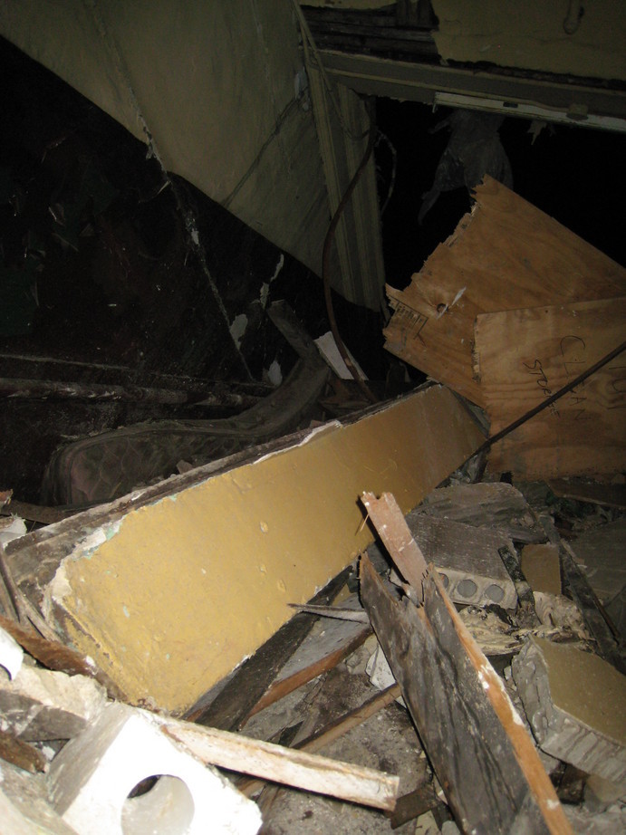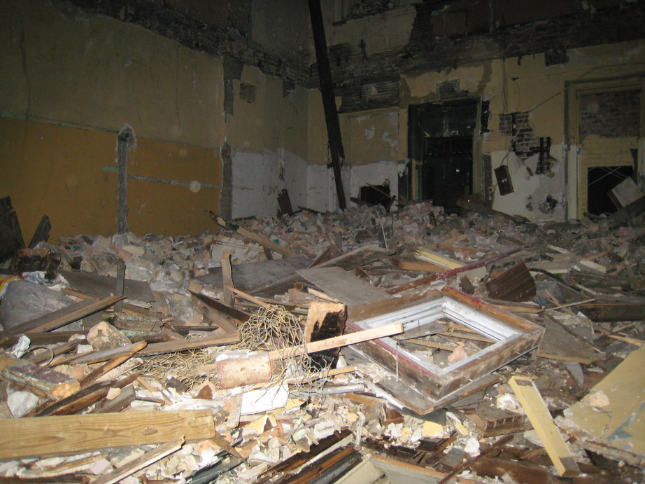 Piles of broken masonry, plaster, and wood underfoot everywhere - zer0gee was glad to be in 3" platforms when she realized she'd stepped on a nail [and was briefly secured to the floor!]