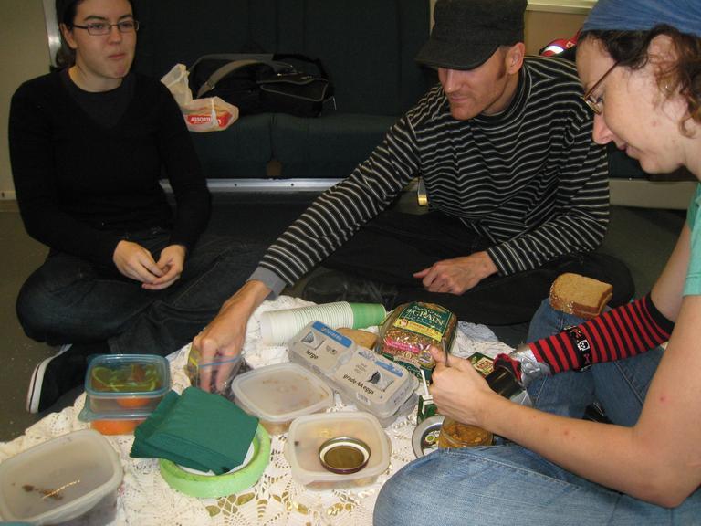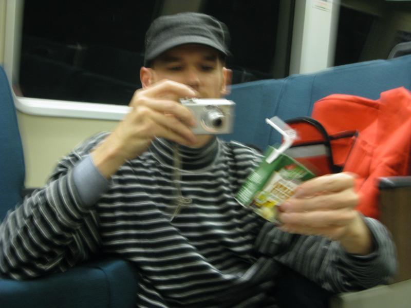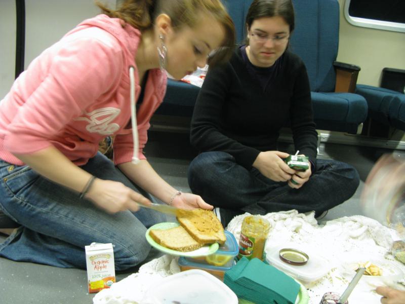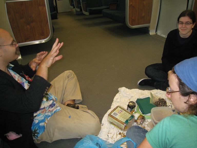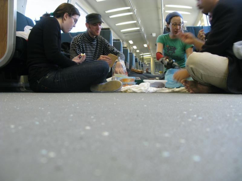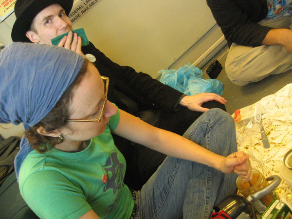 Piratey: What a nice treat to sit with good sf0 folks, eat pbj, and drink from juice boxes. Although BART is a little loud for proper conversation, it made for a nice ambiance to share with friends. We spread a nice tablecloth on the floor. laid out all our treats and dug in! This was also the first time i had met Annnna, so that was fun too! Though there were only a handful of people in the car with us, they seemed remarkably unsurprised by our little picnic. We were waiting for someone to ask us what we were doing so we could invite them to join us, but alas, general BART zombification seemed to have prevailed. Ah well, more for us! Also, when we reached our stop, we had about .10 seconds to get all our picnicing supplies together and get off the BART. Way to hustle, peeple!