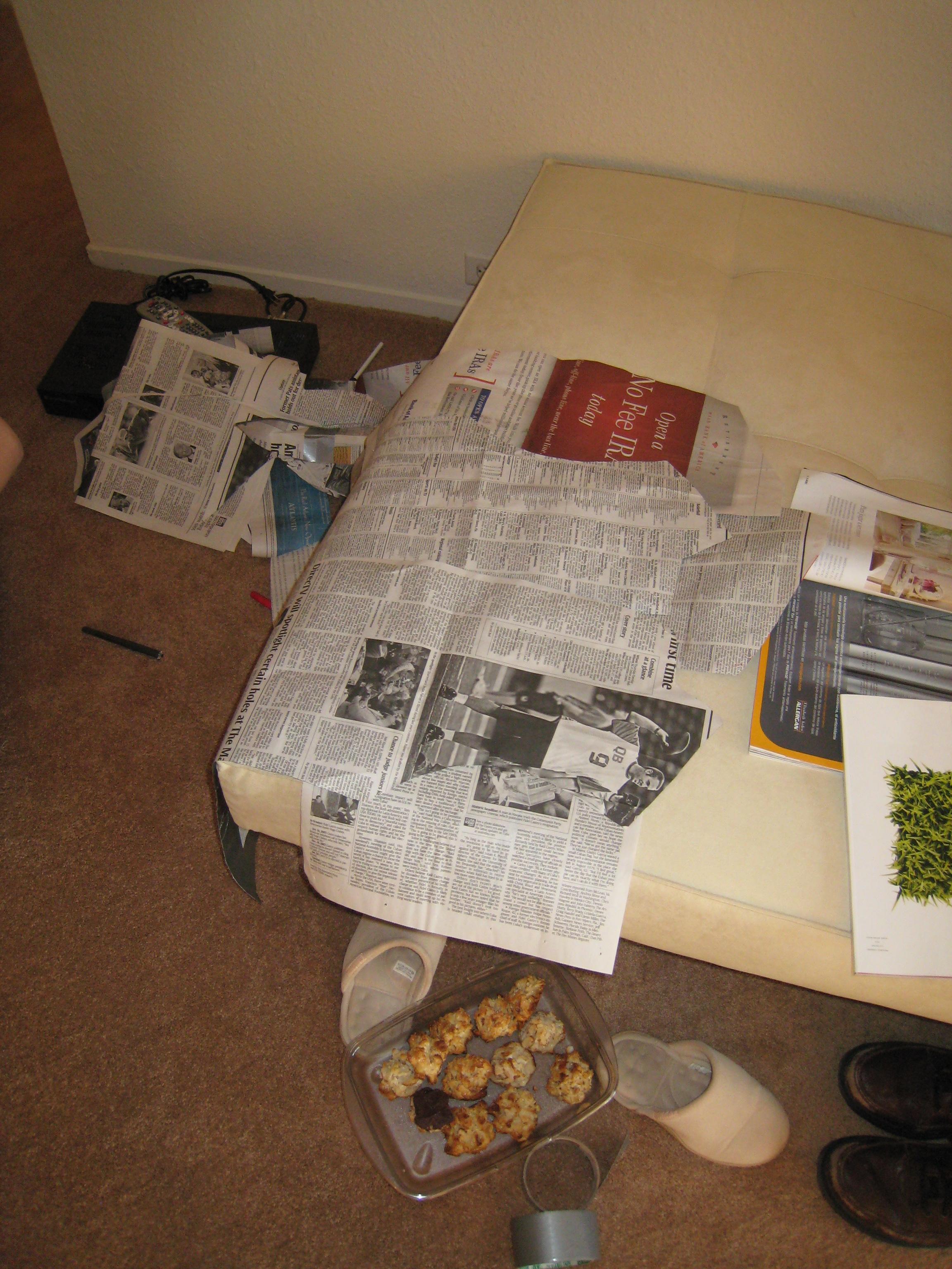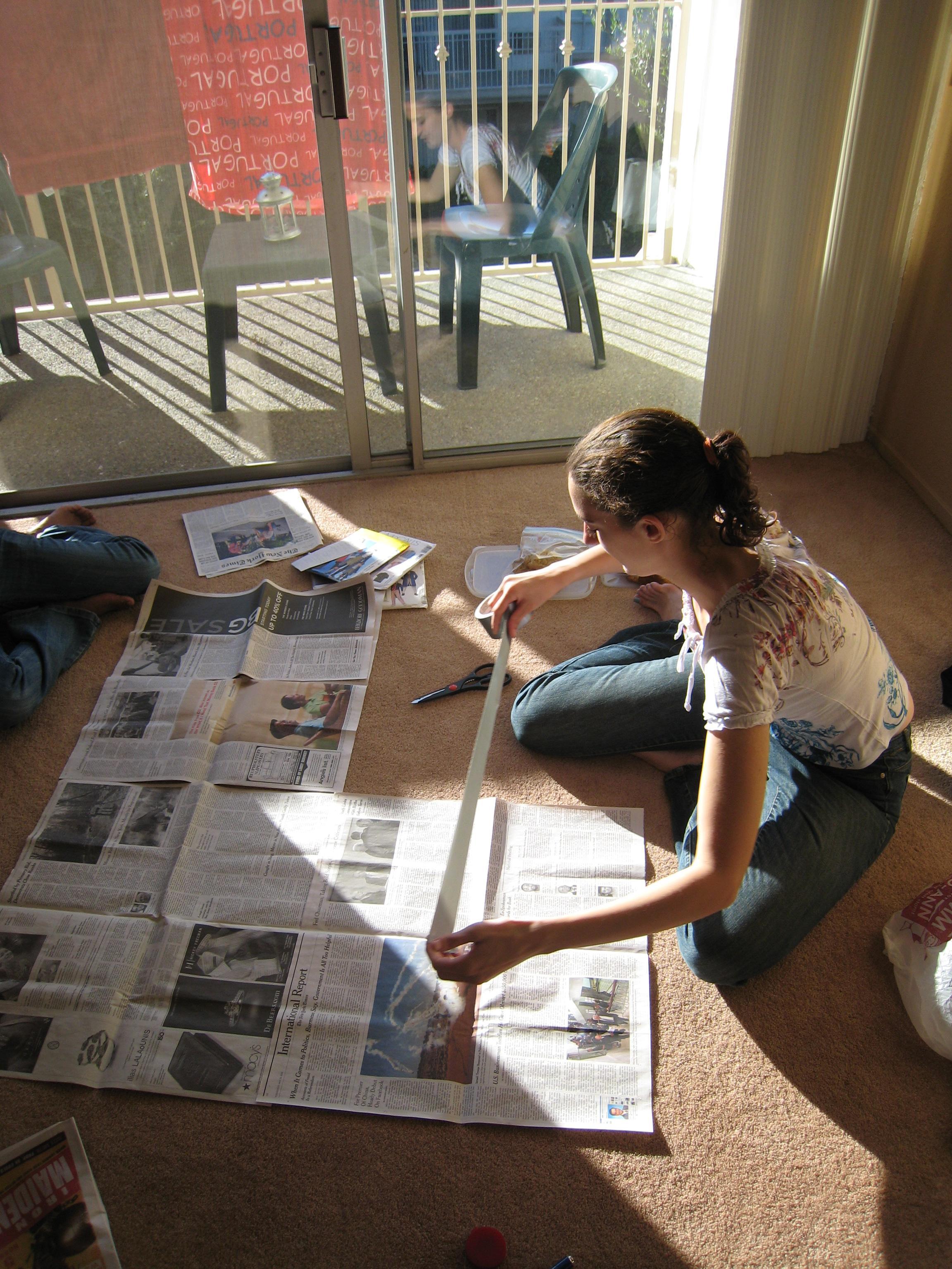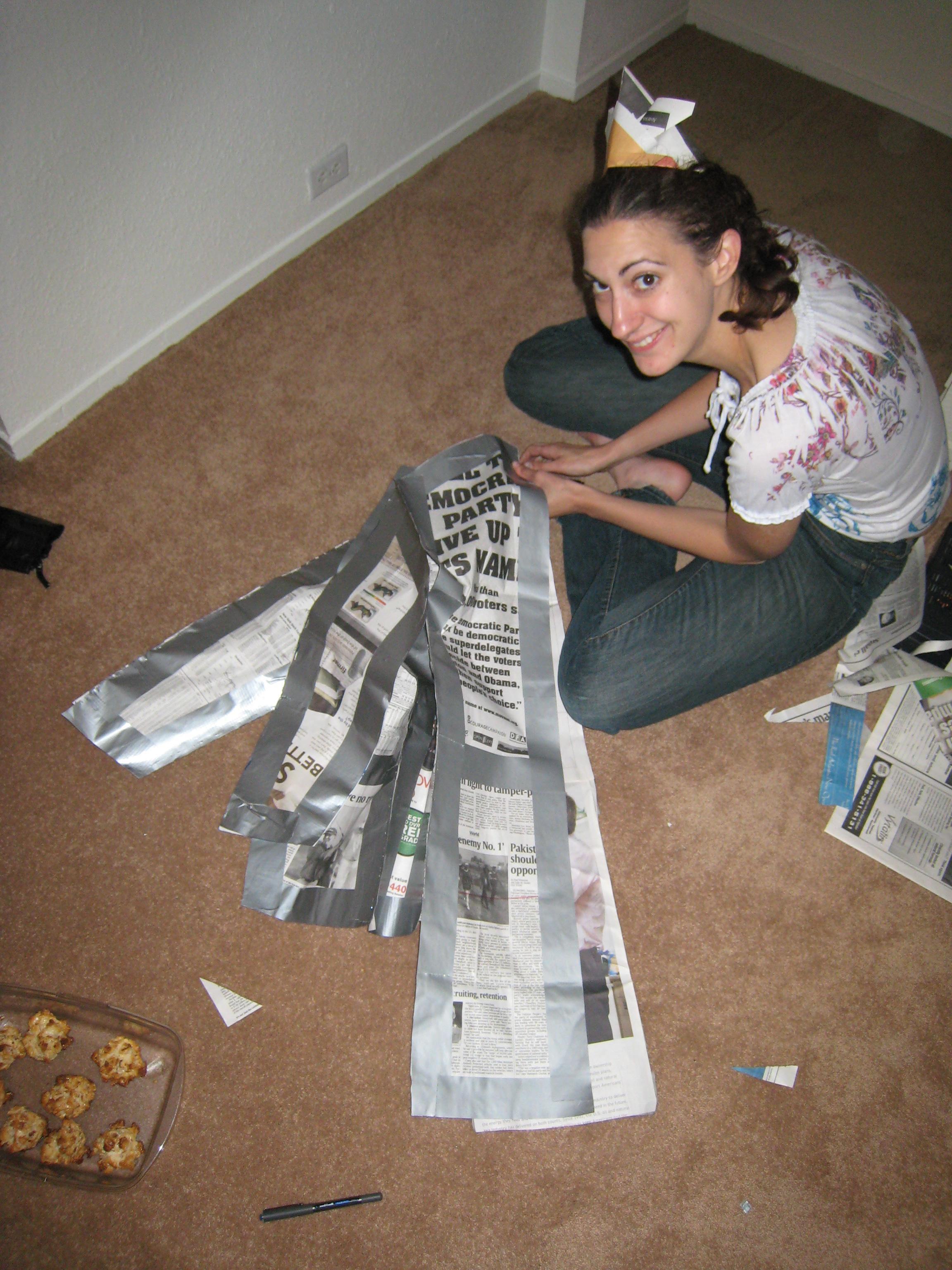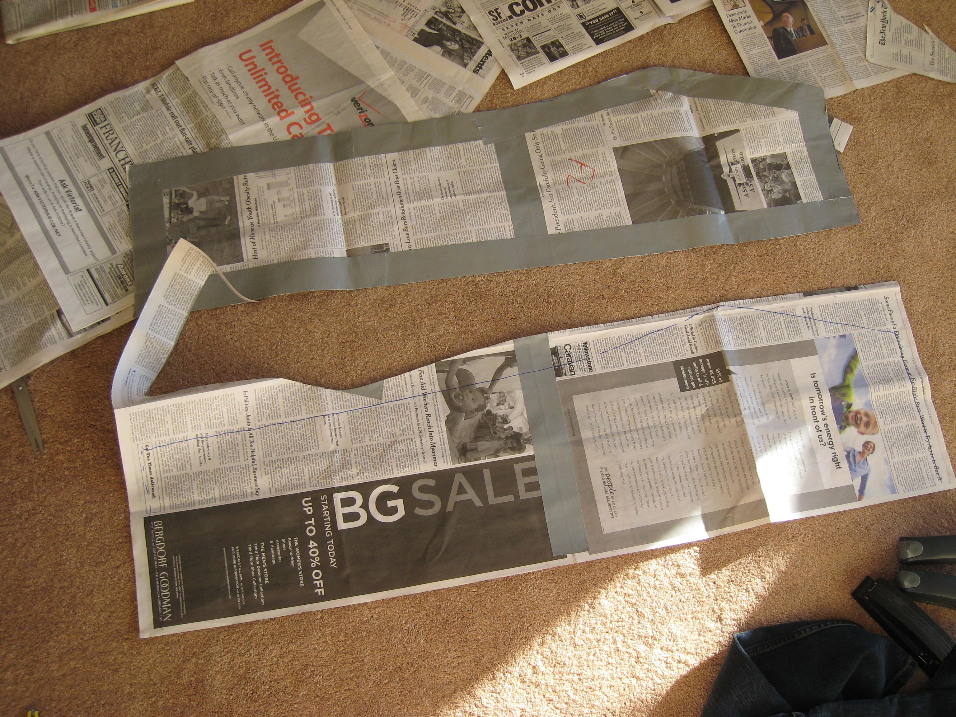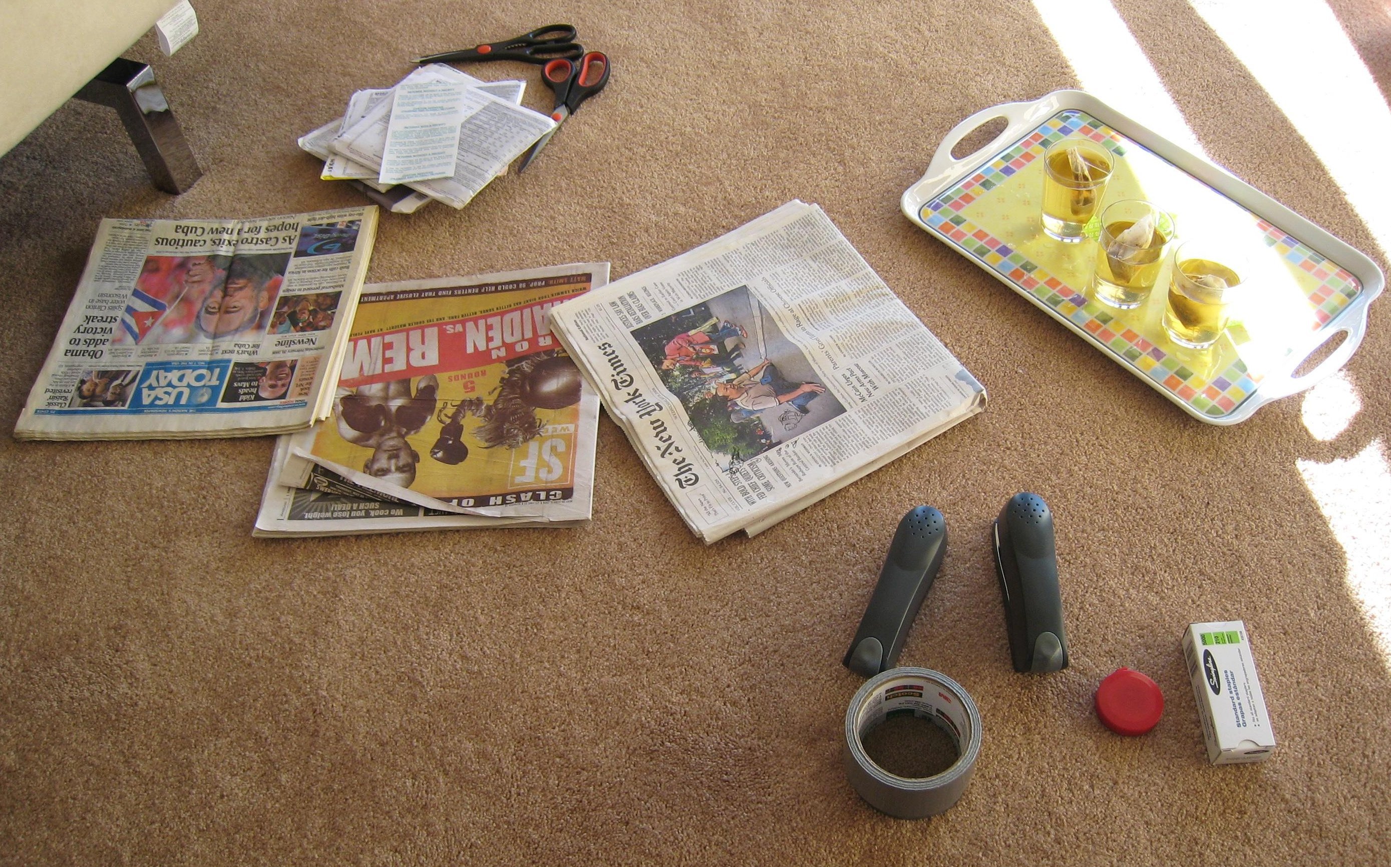 Old copies of The New York Times and USA Today, as well as SF Weekly. Plus patterns, measuring tape, scissors, and plenty of duct tape and staples. Oh, and tea. Mustn't forget tea.