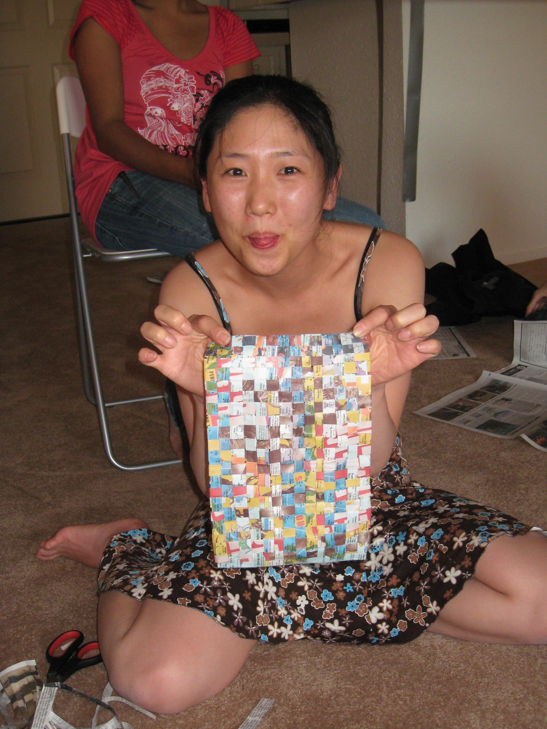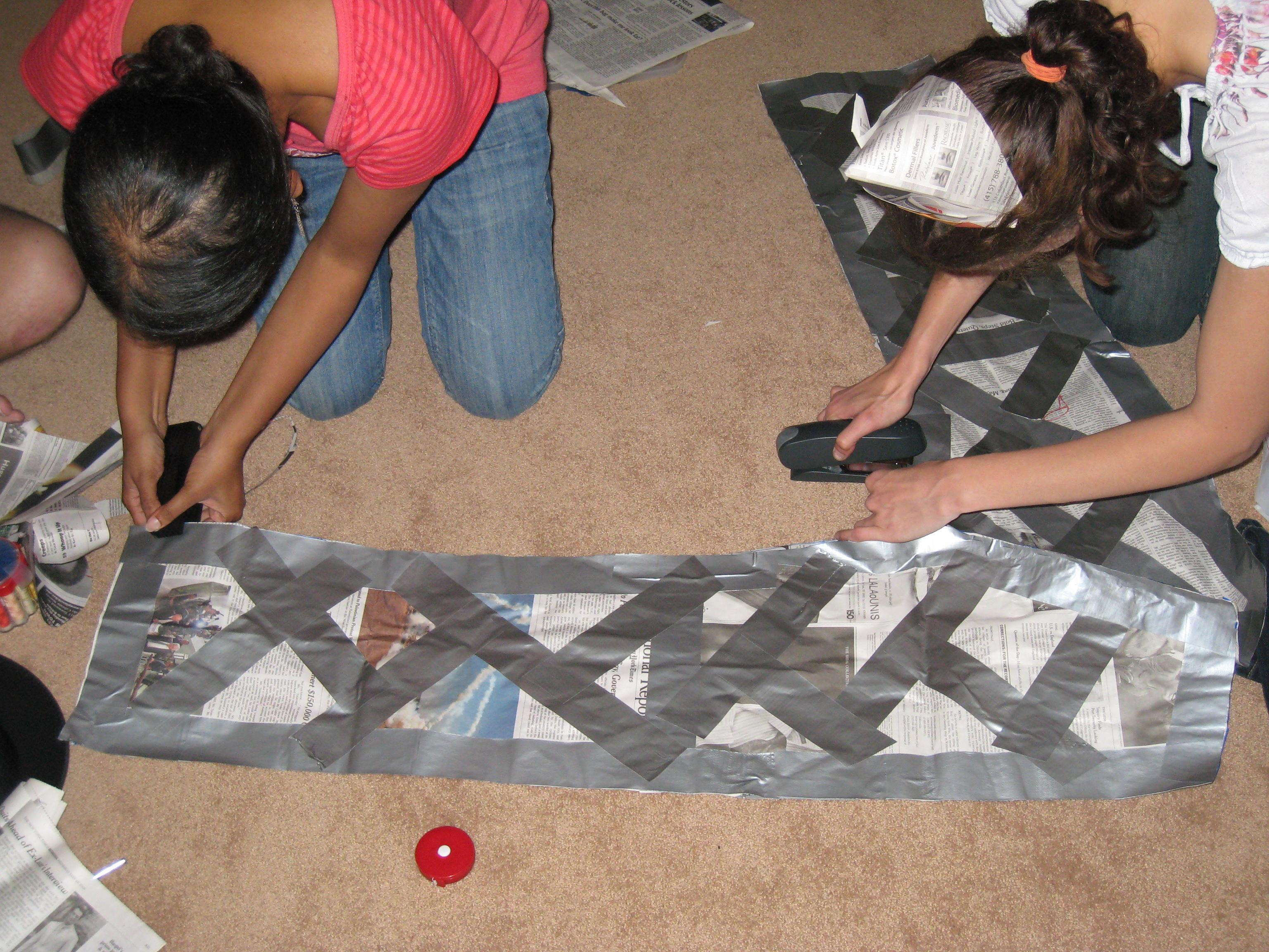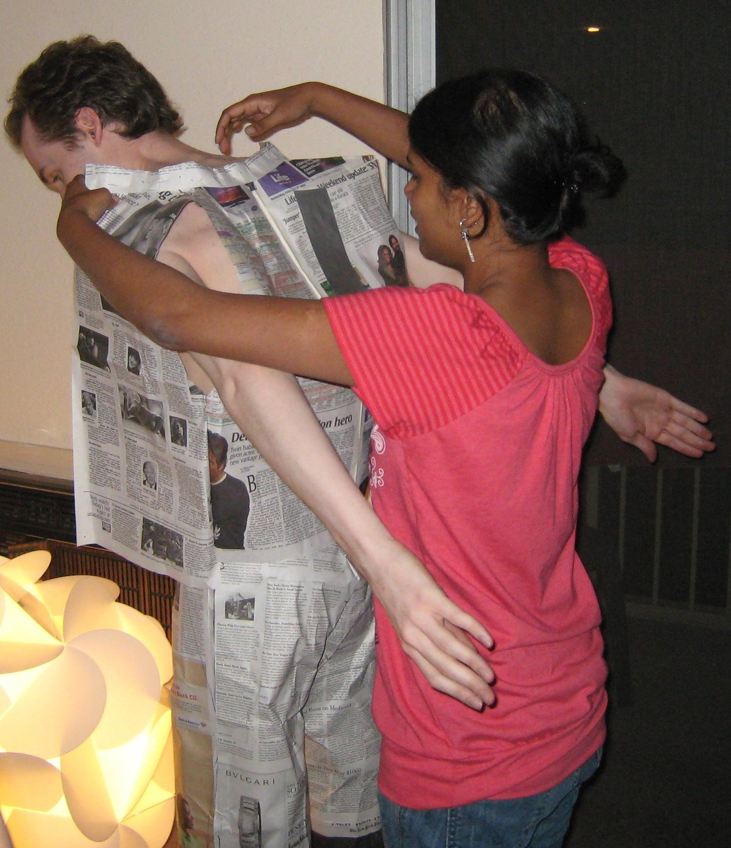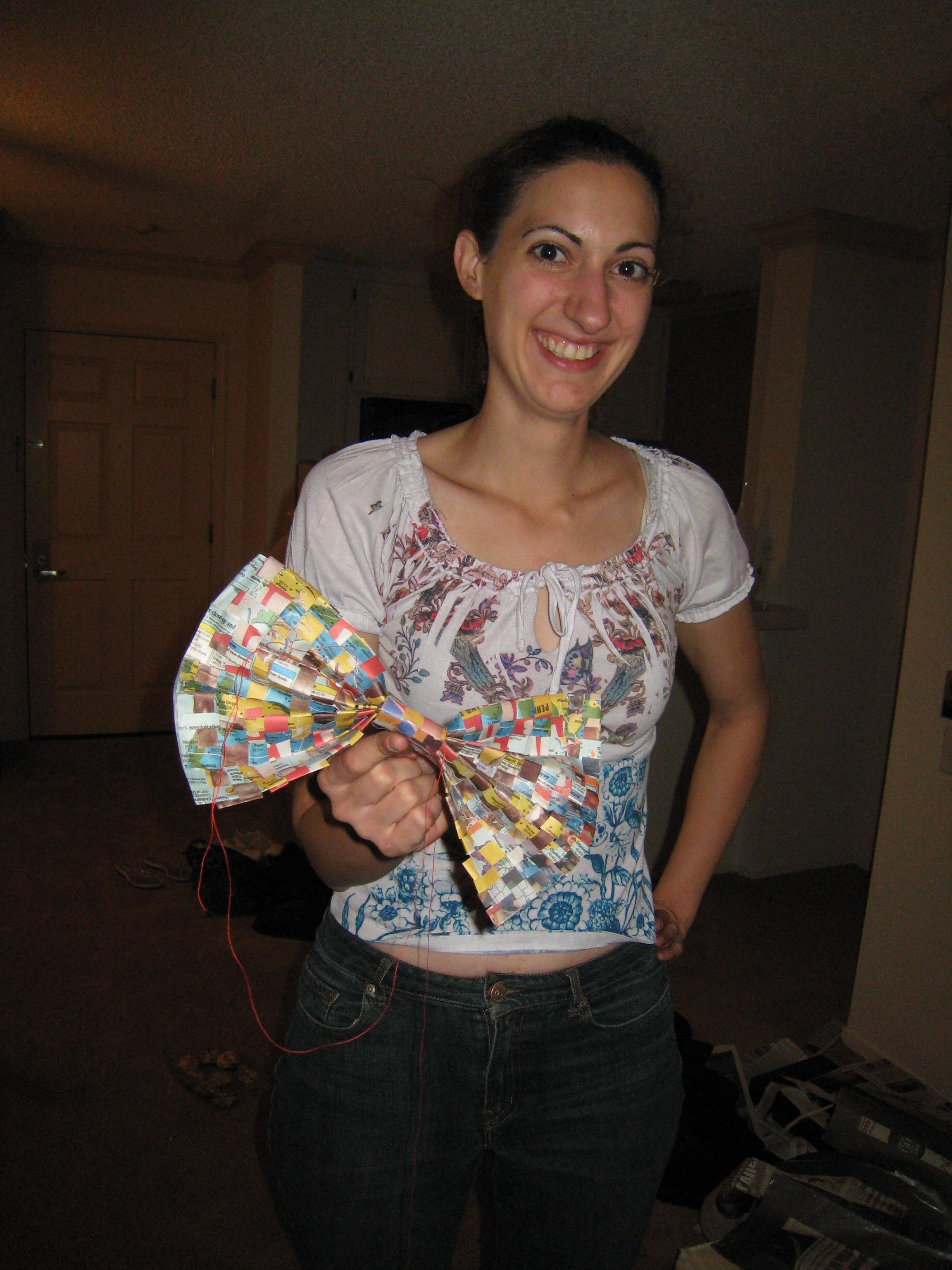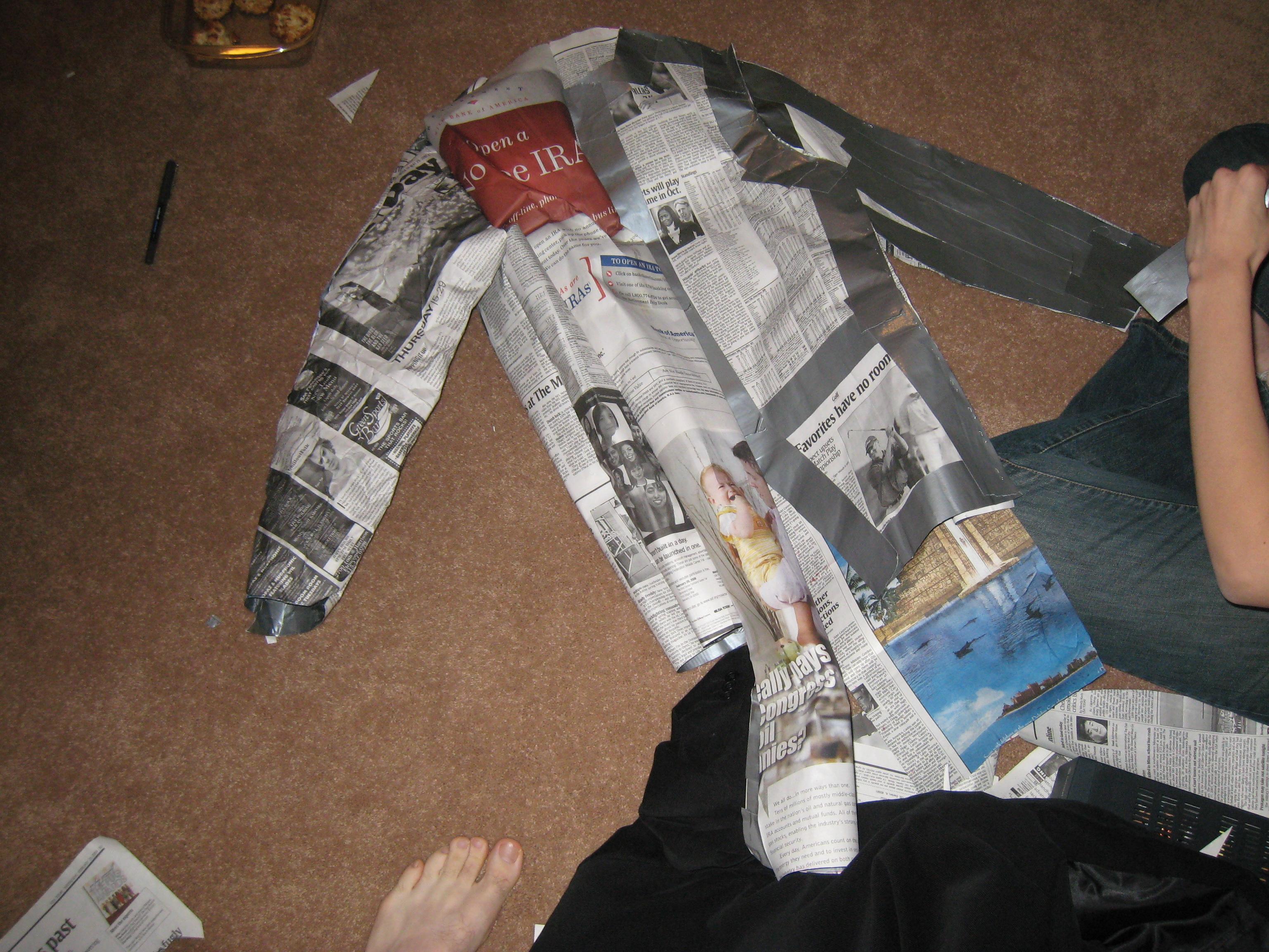 Old copies of The New York Times and USA Today, as well as SF Weekly. Plus patterns, measuring tape, scissors, and plenty of duct tape and staples. Oh, and tea. Mustn't forget tea.