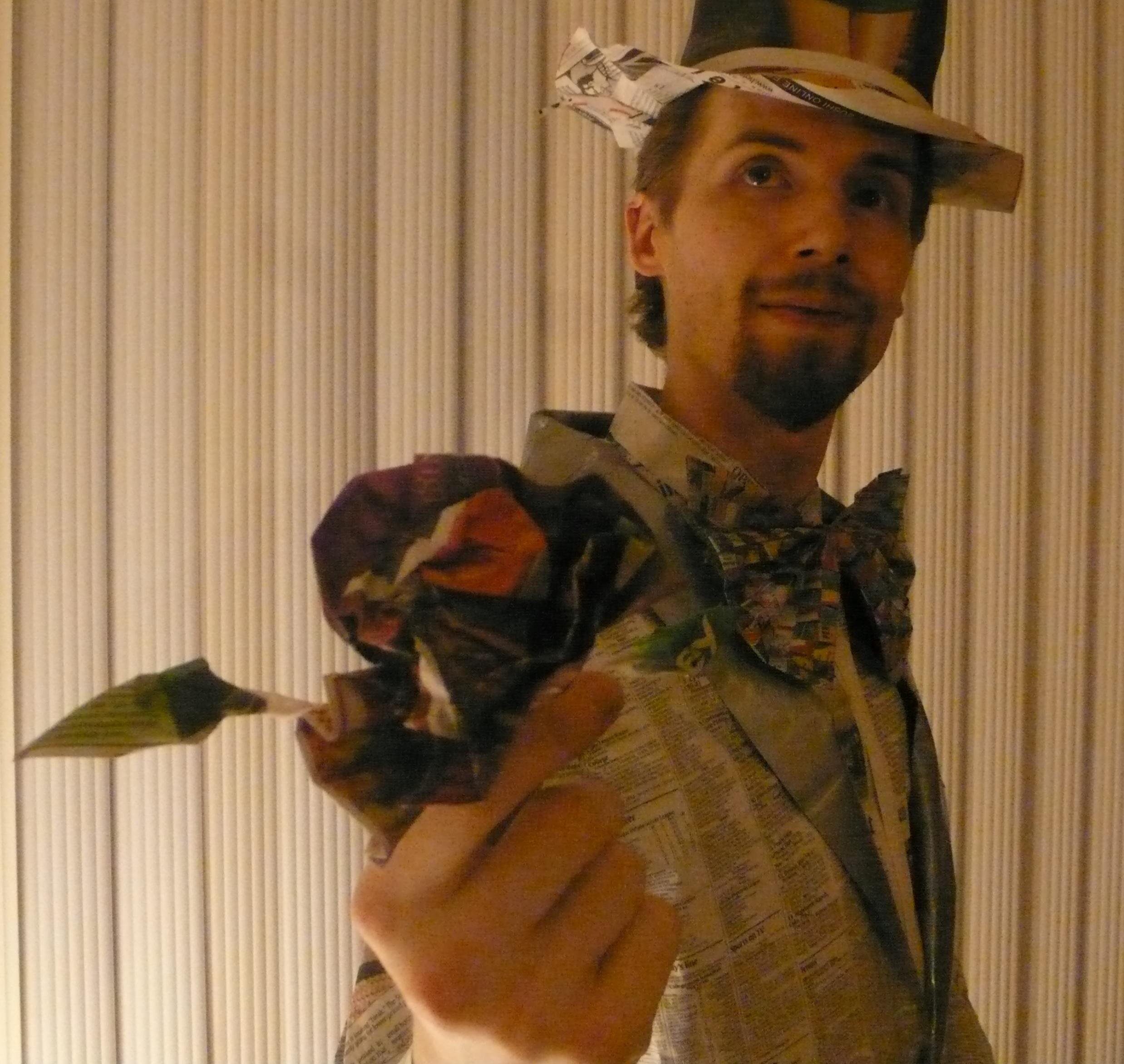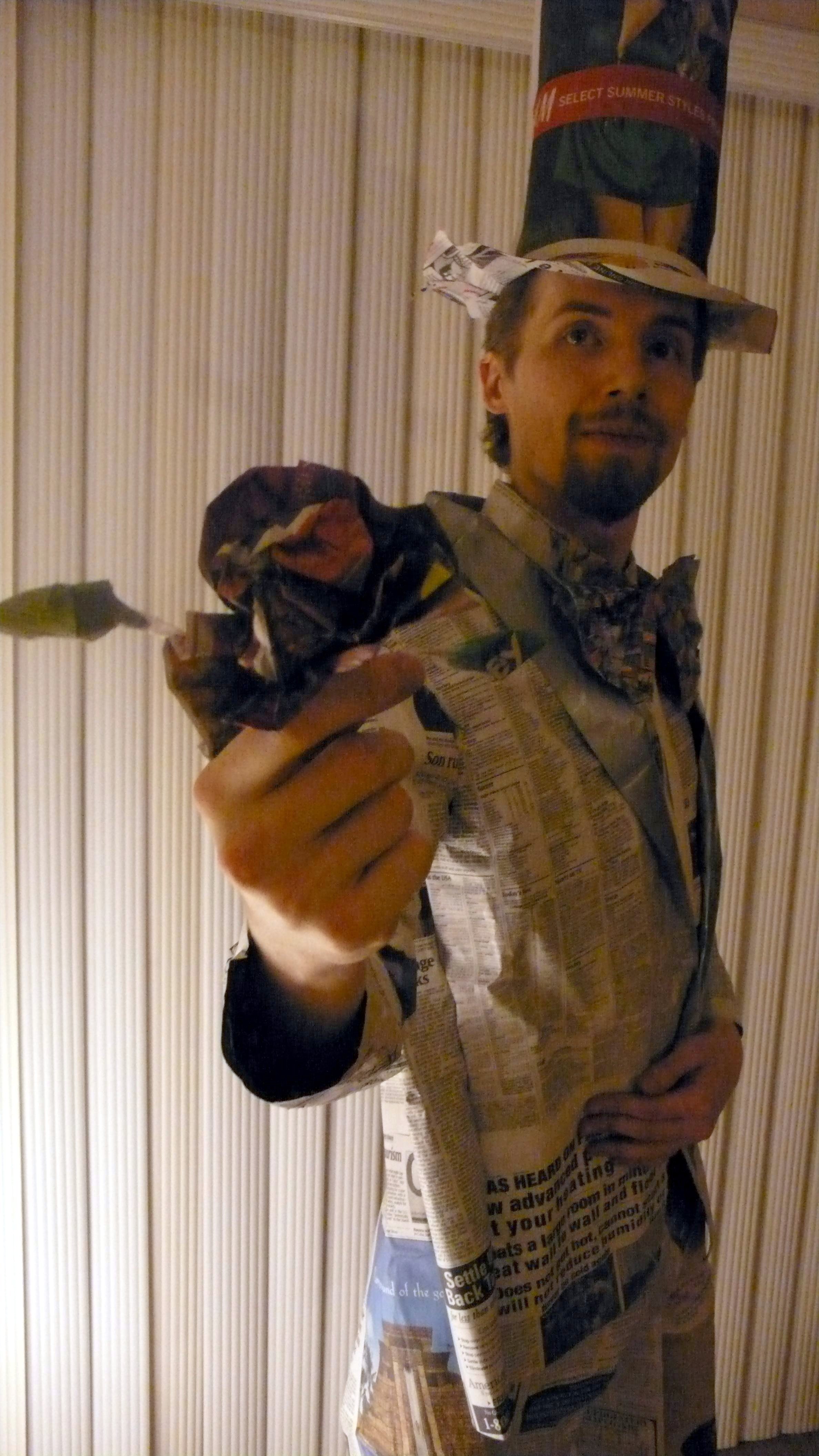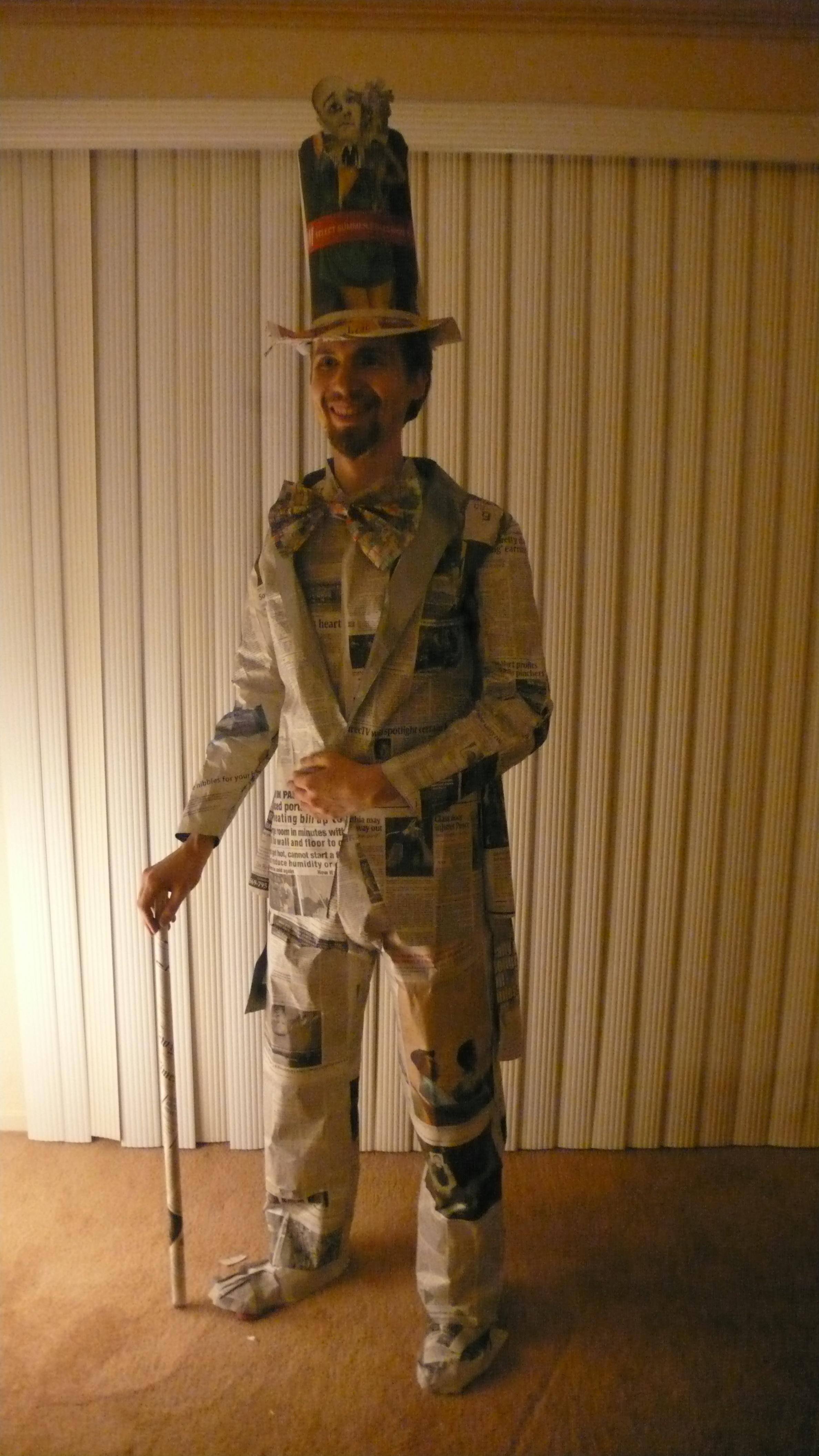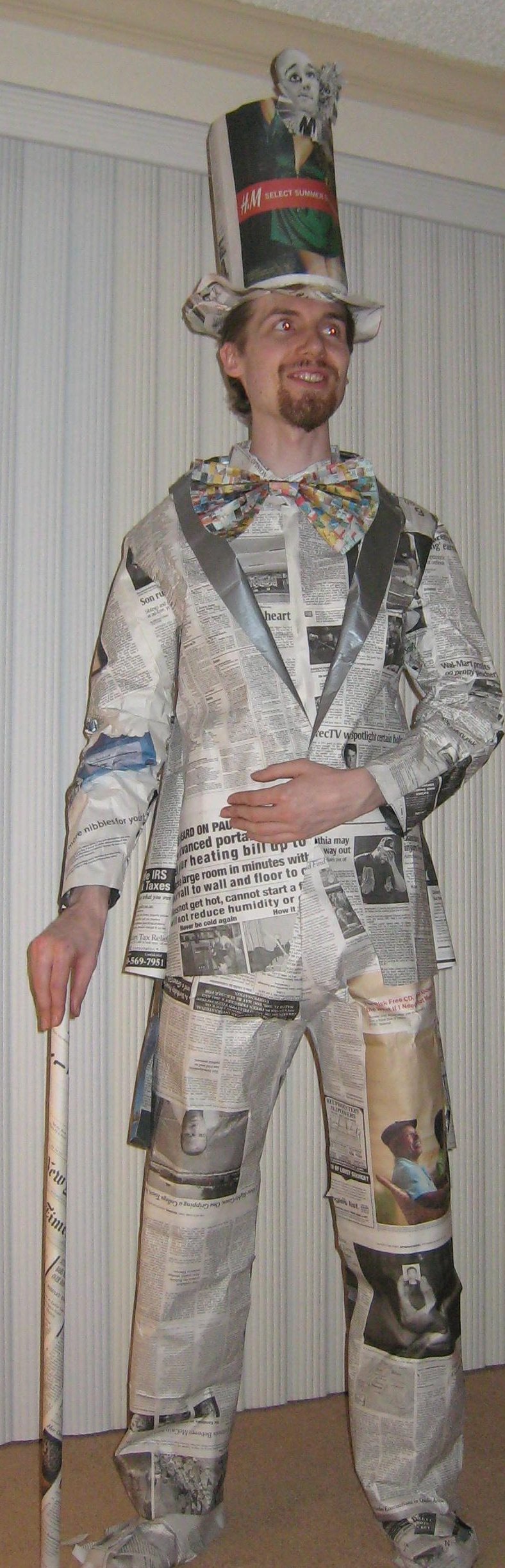 It's actually a tails suit. And yes, Eccoglyph is wearing a samurai hat made out of newspaper. It wasn't quite clear how to construct a hat for the suit, though it was clear that we needed one.