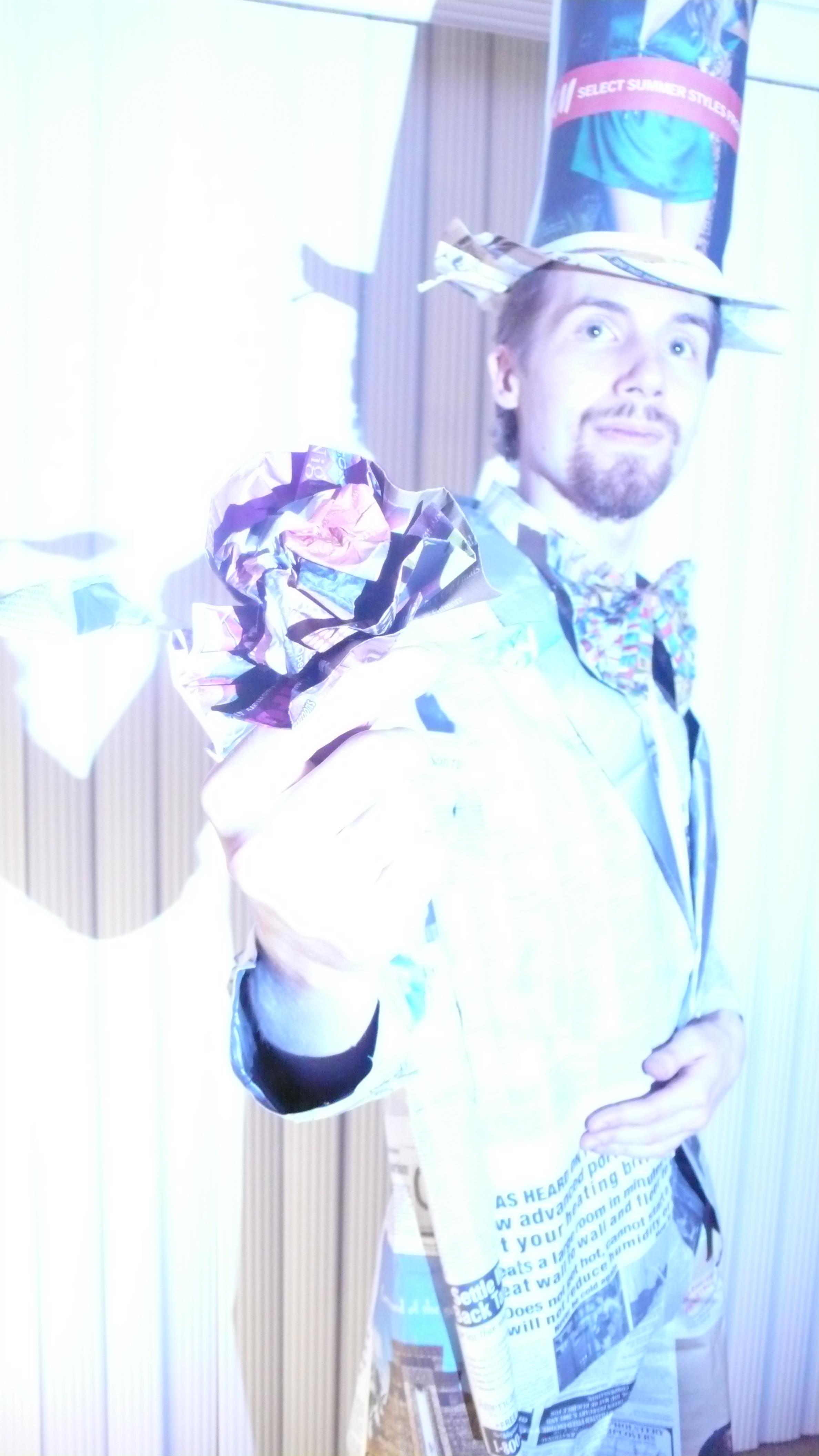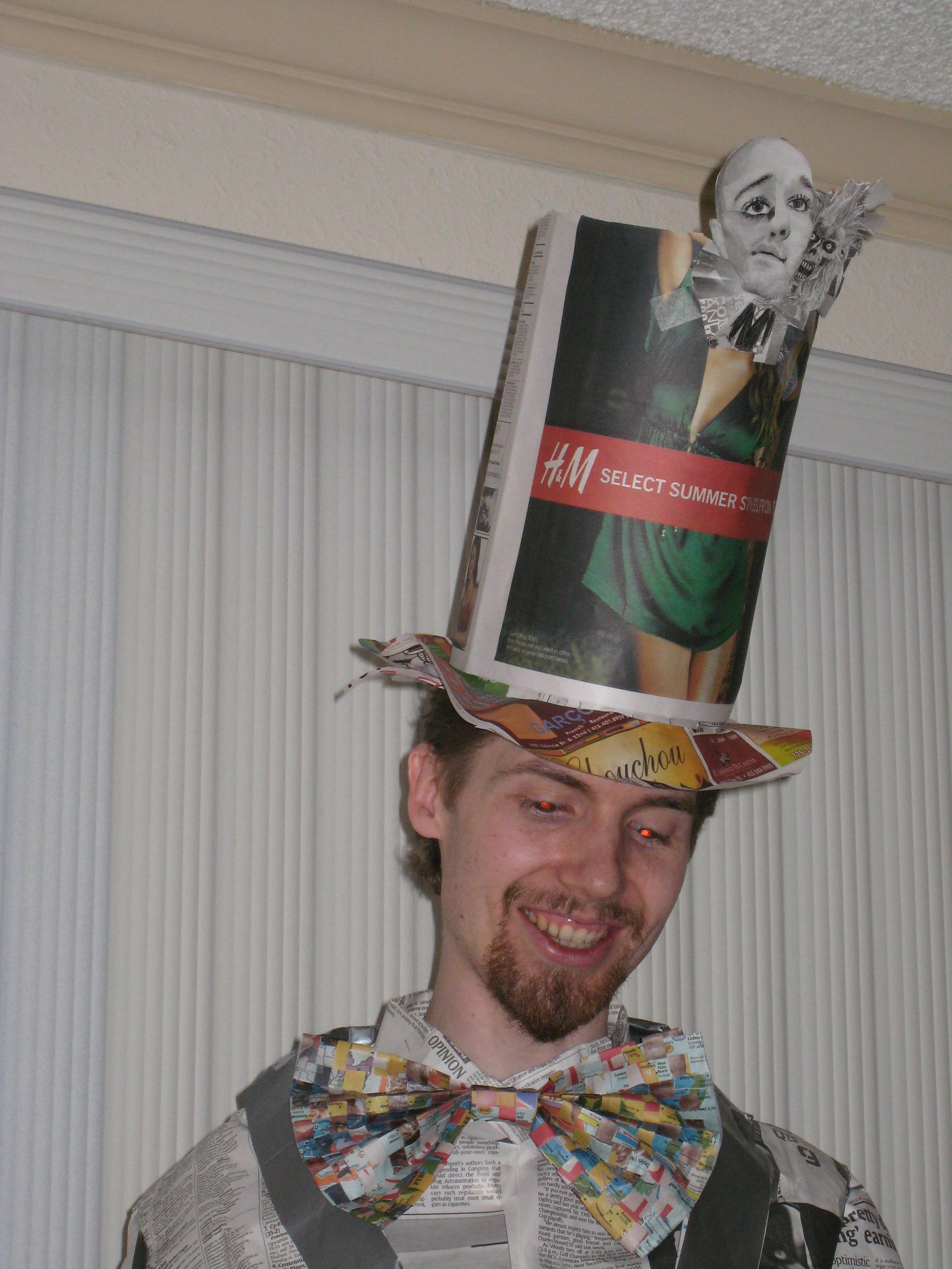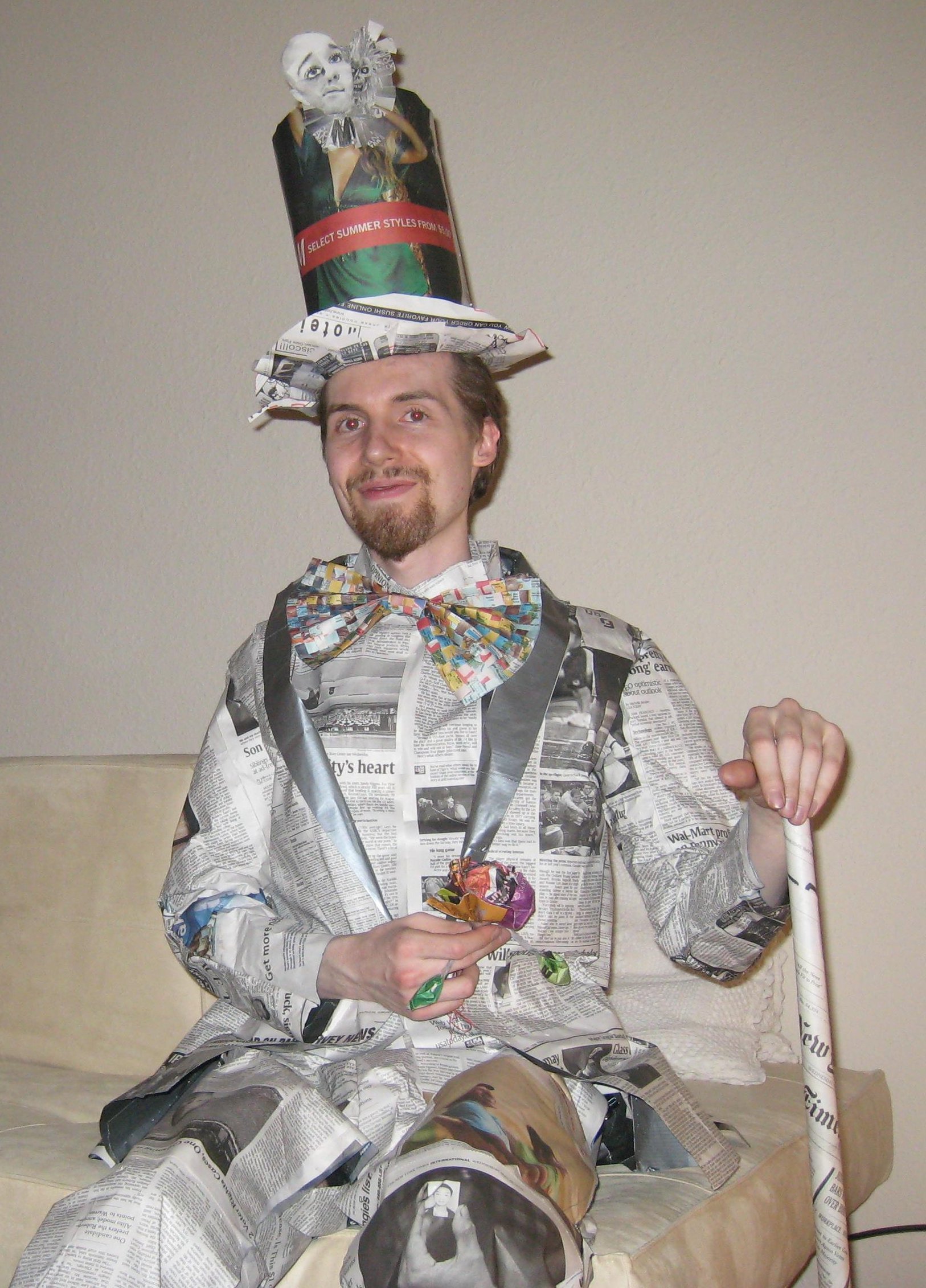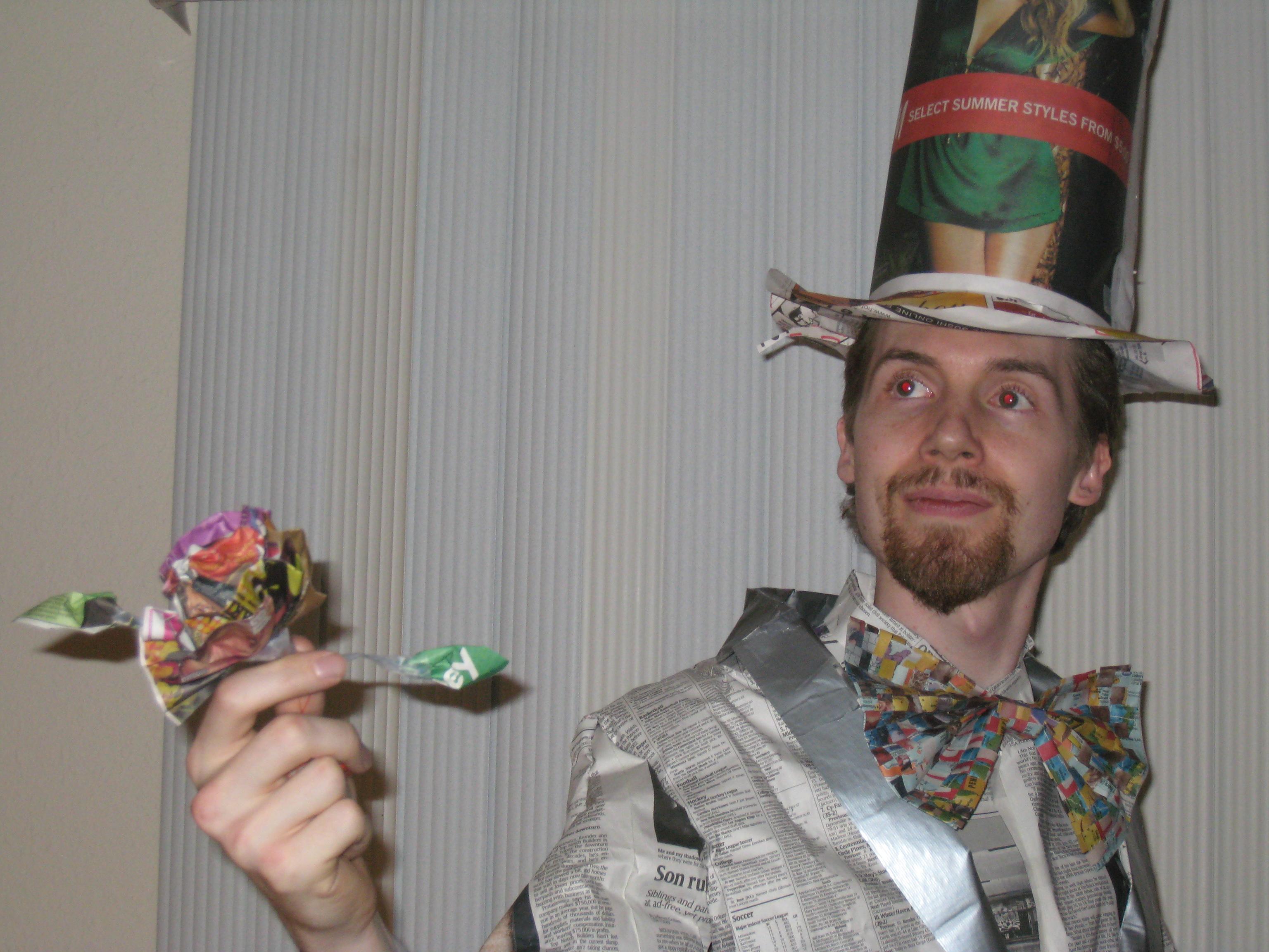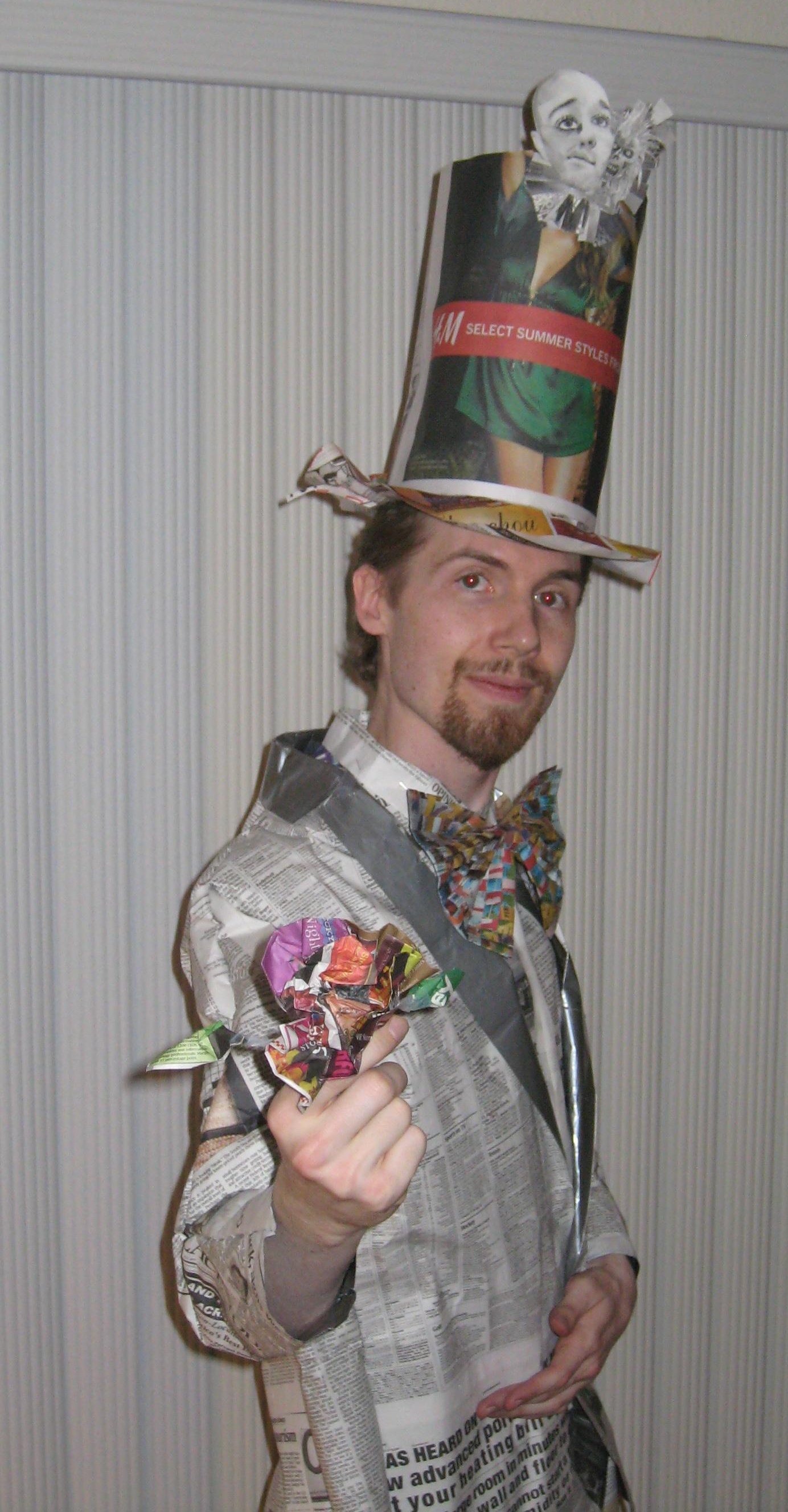 It's actually a tails suit. And yes, Eccoglyph is wearing a samurai hat made out of newspaper. It wasn't quite clear how to construct a hat for the suit, though it was clear that we needed one.
