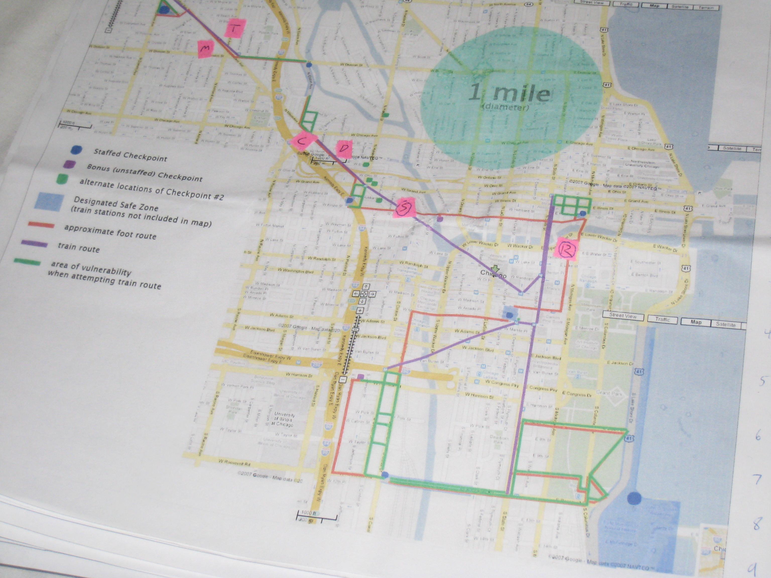 A Chicago map, a journey map, several sheets of instructions, and a number of sticky notes to attach as players and chasers moved through the city.