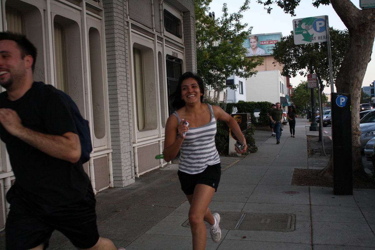 I kept seeing more and more player chasers...many more than had been expected, this early in the game. I became another informant, then, for Dax--calling in the number of chasers I was seeing, and letting him know to rein in the staff chasers. Especially given the density of chasers, it was nice to be invincible--walking around, involved with the game, but with my only responsibility to get where the action was. Strangely enough--partly from this invincibility, partly from the running--I started to regain some of that feeling of confidence in my own movement, knowing that I could easily get across the street without getting hit and take pictures of the chase. I eally did feel kind of invincible.