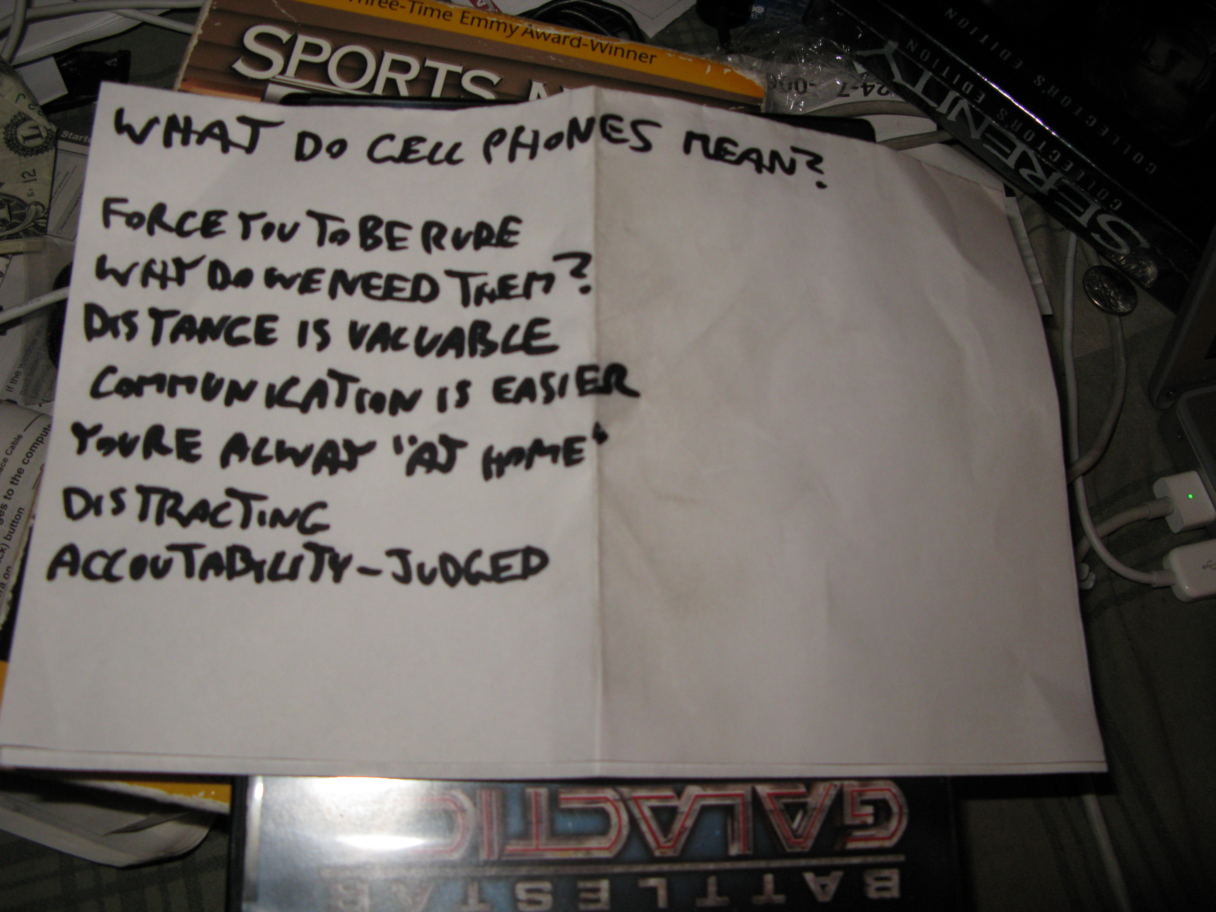 Lincoln: I kept with me on my person at all times a piece of paper that asked the question "What do cell phones mean?" And every time I came up with any thought on the subject I would write it down on my piece of paper. Mostly what I made on that piece of paper was a list of pros and cons. And the list of cons is large. I just got my first cellular telephone about two months ago. I have been opposed to the idea of them. And my list proved why. Another disadvantage I wrote down rather quickly was the question "Why do we need them?" I mean we humans functioned as a race without the use of cell phones for centuries with no problems at all. We mapped the world without cell phones. We organized and scheduled complex systems like a major league baseball season without the use of cell phones. We went to the moon without cell phones. So, why do we need them? To make the world more immediate and accessible? I suppose. I have a lot of actor friends who say that they need their cell phone, because if their agent calls and wants them to go into an audition or whatever, they need to be available right now or else somebody else gets the part. Handy, right? Sure, but that has only become the case recently since the popularity of the cell phone. Sparticus was cast without any cell phones. Maybe this cell phone society where everybody is easily accessible and ever available isn't desirable. Maybe. I like to kick back and relax every chance I get. And this cell phone society has almost completely robbed us of that ability. (the flip into pointlessness, the techne for its own sake)