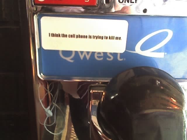 "I think the cell phone is trying to kill me." I printed up a whole sheet of these labels, thirty of them. And stuck them around.
