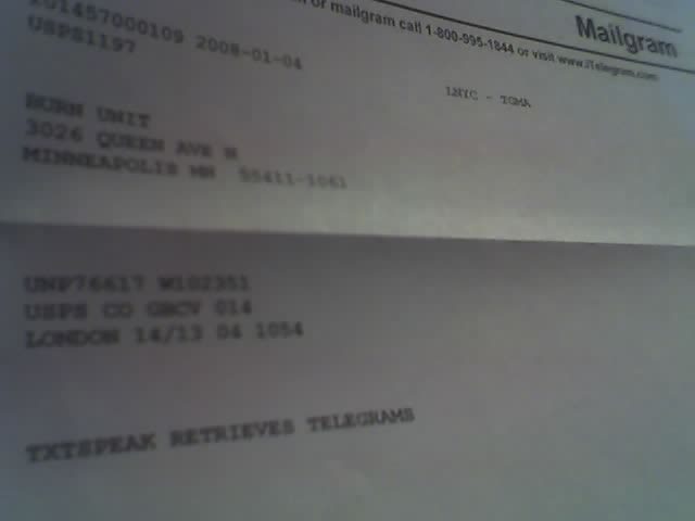 Charlie Fish & Burn Unit: Txtspk rtrvs telegrams. The succinct, abbreviated language of text messages harks back to a time when important messages were paid for by the word. While the method of delivery has changed, texts echo telegrams. Yet texts are more accessible - which arguably cheapens them metaphorically as well as economically. Believe it or not, you can still send telegrams, so I sent one across the Atlantic to Burn Unit to illustrate the point. This was unexpected! I got this thing in my mailbox, a letter. At first I was completely baffled, figuring it to be some kind of weird direct mail offer. Then I looked closer and saw TXTSPEAK RETRIEVES TELEGRAMS. In that moment, my heart sang because I knew Charlie was completely right. This photo was, of course, made with my cell phone.