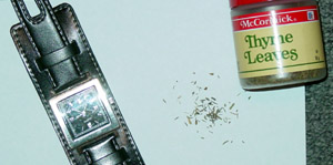 A watch telling the time and some dried thyme.