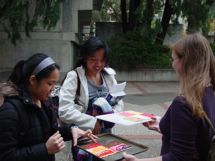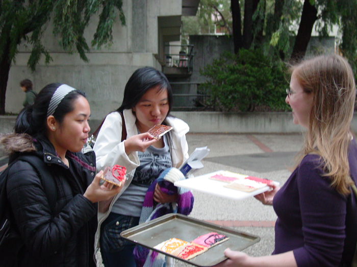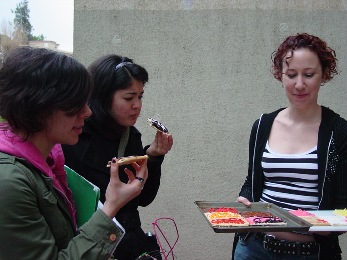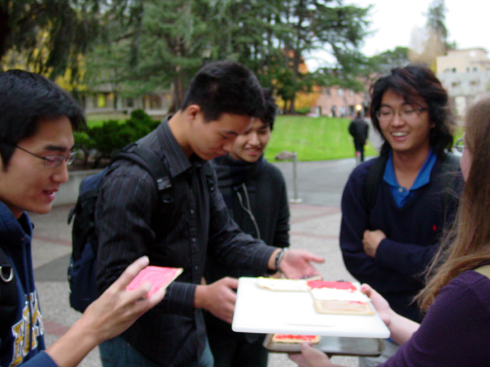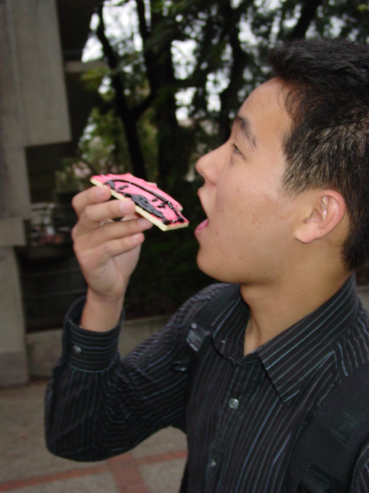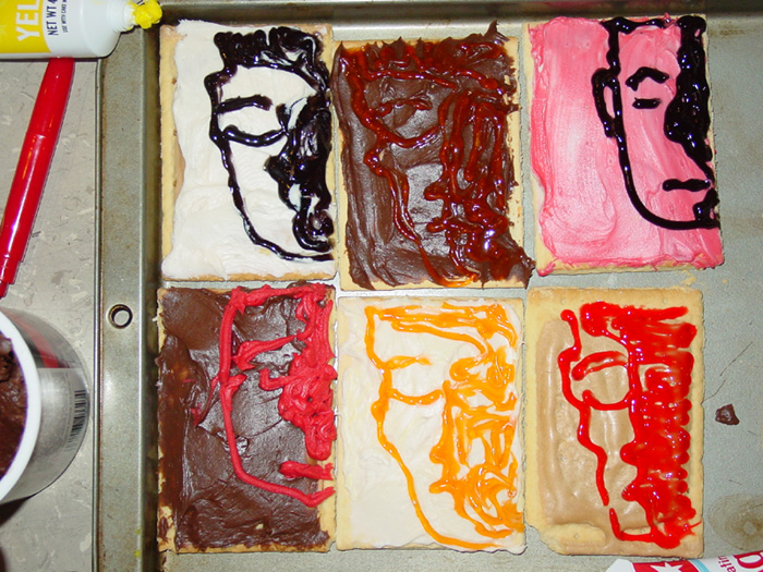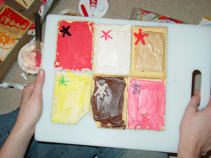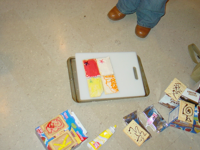 Armed with a ridiculous amount of Pop Tarts, I met up with Piratey and we went at it. We decided to do art specific to SF0--so we have Oliver and Avidd, Warhol-style. Since we were decorating in the Art building on the UC Berkely campus, we got critiqued by a real live art student. He said it wasn't really pop art, as we weren't using popular culture references, but we figured our images were iconic enough within the SF0 community to count. Then we took it outside and let the tasting begin. The Olivers were very popular (more icing). The tasters through they were delicious, and aesthetically pleasing as well.