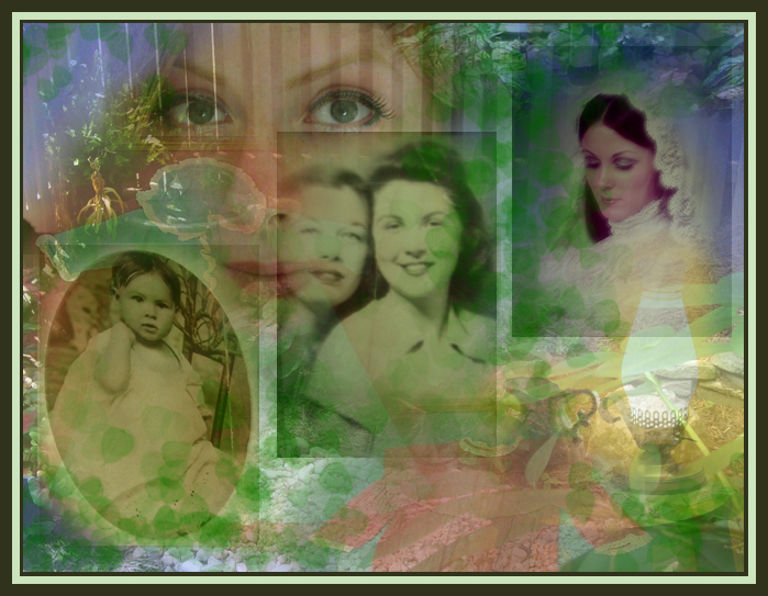 In the background of this collage is my mom's Secret Garden that she keeps in her side yard. Secret Gardens are something of a tradition on my mom's side of the family. Also in the background are two dresses worn by my great grandmother when she was a child. The collage features a picture of me, at age 27, my mom on her wedding day at age 21, my grandmother with her best friend in her late teens, and my great grandmother as a baby.