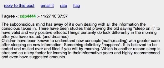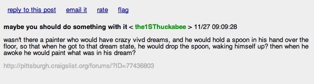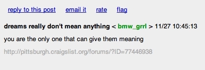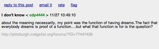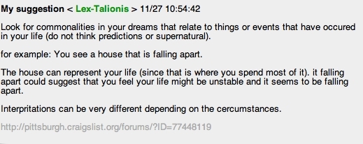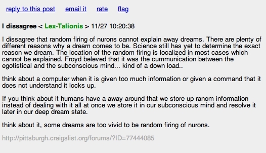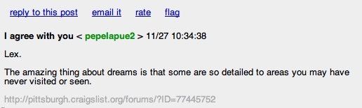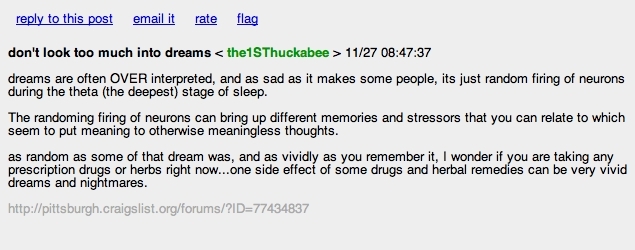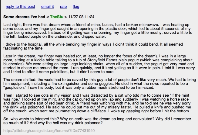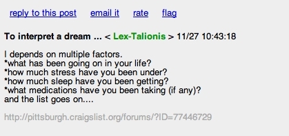 I decided to combine the dreams of two nights and post the amalgamation to Craigslist, since that's certainly "such strangers" and helps me keep track of who said what. (My memory is so bad that asking a passerby would probably result in a lot of "some dude told me something about Freud and my hamster" without much detail. Craigslist gives me text to post here.)