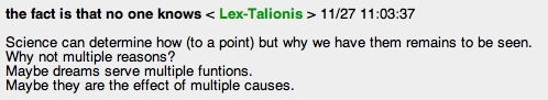 November 27th, 2007 9:23 AMI get some really, really wacky dreams. I don't think much of them, and I don't generally get too worked up over them. That said, this sounded like fun, especially since I get those wacky, wacky dreams. Also, tasks with nothing having hit praxis for them make me sad, and completing one makes me happy.