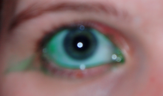 Still, I knew it would be stupid to drop a whole drop of potentially harmful material into my eye, so I tried a little bit first. I took a Q-tip, got it wet with water, and dropped some green food coloring onto it. I touched this gently to my eye. The sclera stained a little, but the green washed away pretty quickly. I had no noticeable bad reaction, so I decided to let diffusion do the job for me. I made myself tear up a little, dropped a bit more green onto the Q-tip, and touched the Q-tip to my eye again. It worked pretty well: the color swam its way through my tears and stained my cornea/sclera: