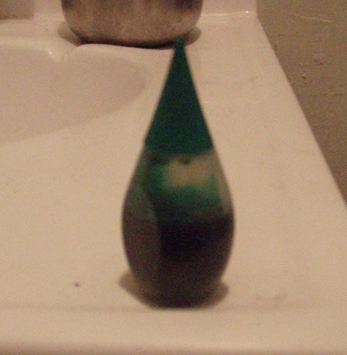 I did some research online. There are a bunch of people who have dyed their eyes with food coloring (you can find a few on youtube who did it in the most awkward ways possible), and though that doesn't mean it's okay, it means maybe it wasn't likely to kill me. Then I looked up the ingredients of food dyes. They didn't look so bad. I thought back on all the times I'd stained my hands, mouth, and body with food coloring, and how I hadn't had any bad reactions. Here's the cute green dropper: