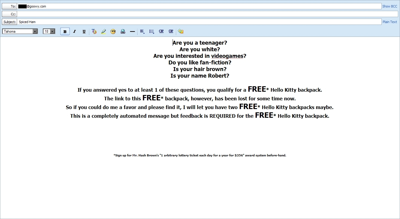 I sent a fake spam message to one of my good friends, Yushen. I'll post his reply if or when he sends it.