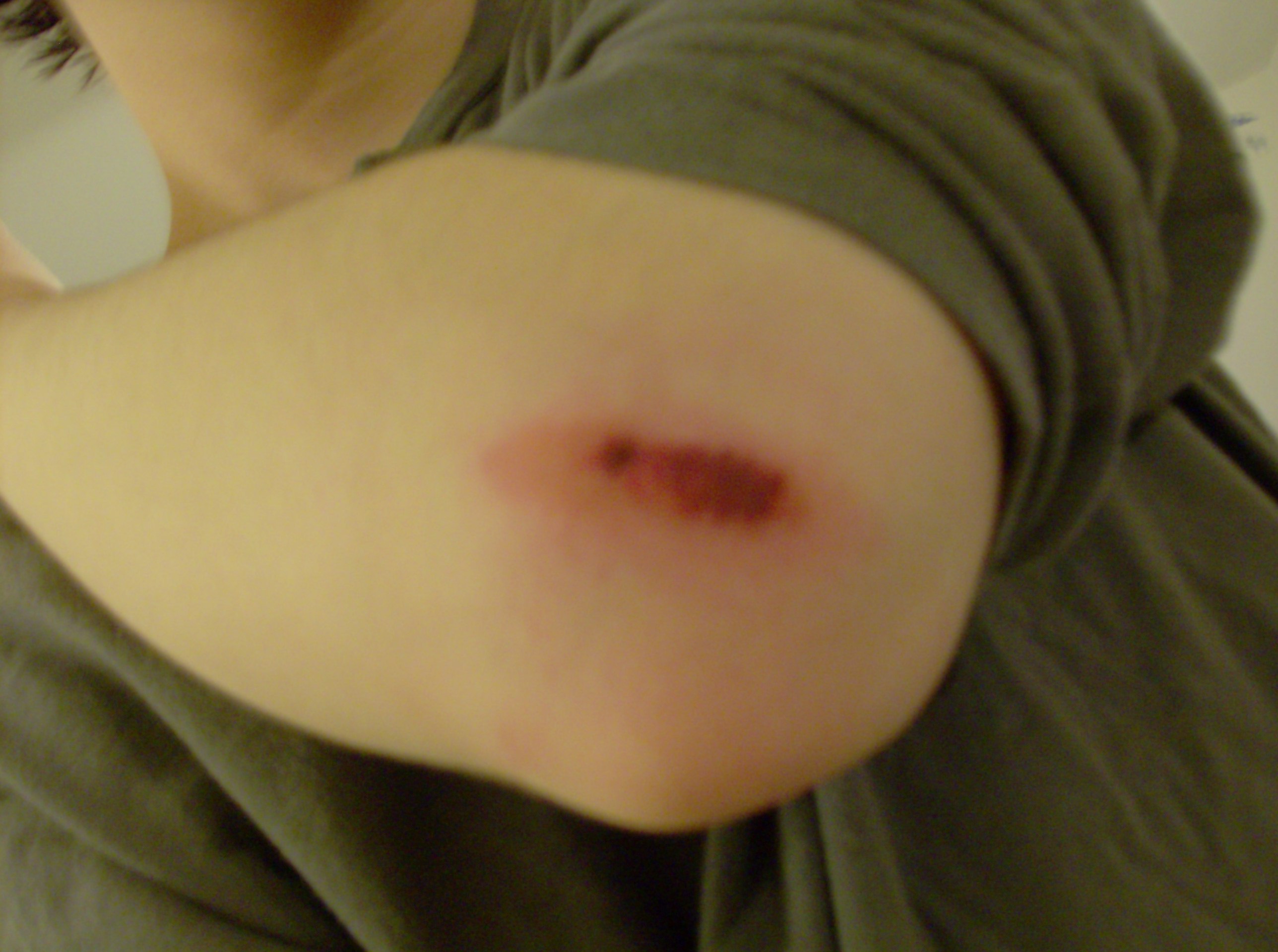 What happened was, I was walking on a street-like area with black asphalt, and at 6AM its really dark, so i couldn't see the incline in the road. I tripped and landed on my right knee, then on my left elbow. I was wearing a jacket and jeans so my skin didn't come in contact with the ground, but it did leave a mark. o_o
