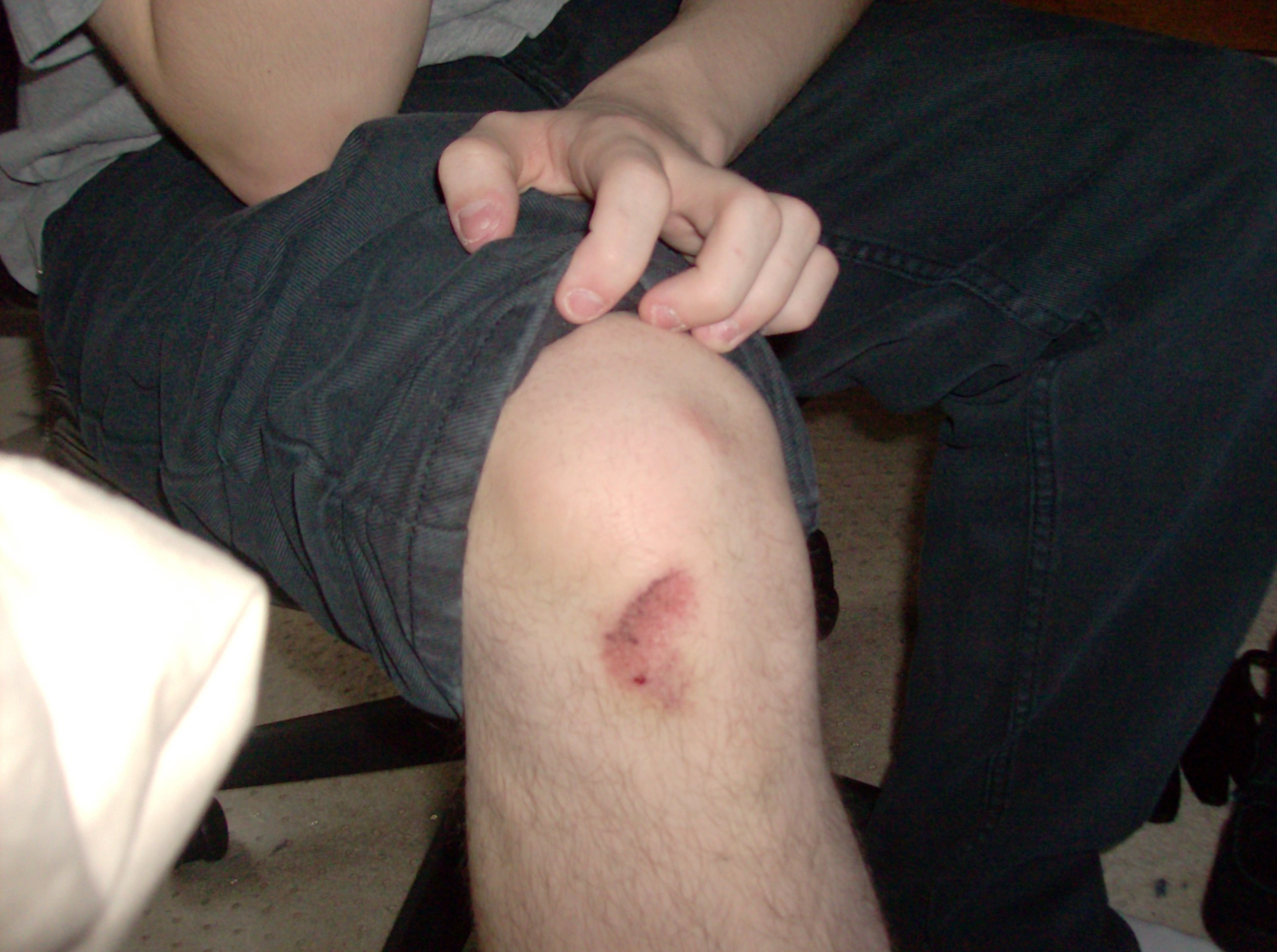 I obtained several injuries during the fall. In detail, I first, landed on my right knee, giving me the clearly visible scrape on my knee, and above that is a very slight scrape, hardly visible. After that, I somehow managed to bruise my left thigh but it was shielded by my poor DS, then I landed on me left elbow, and was able to to get a much less severe scrape on the back of my left shoulder.