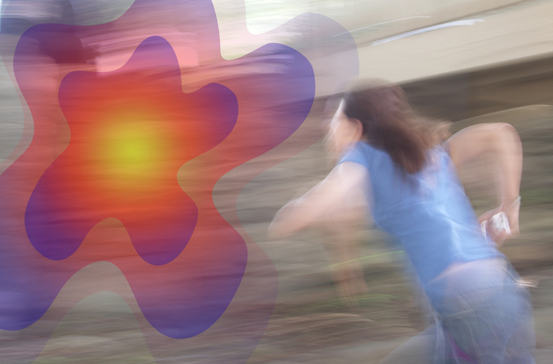 Moments later, the sound of running. If only we hadn't just packed the cameras away! A woman burst into the clearing, her clothes bloodied, a rifle of some sort slung over her back. A cord hung off the backpack, with brightly colored, conical hats (a puffball at the tip of each one) hanging off it like trophies. She gestured at us sharply, "We're falling back to the old tent grounds! Get moving!" she shouted. She sprinted off through the trees. And then we heard it.