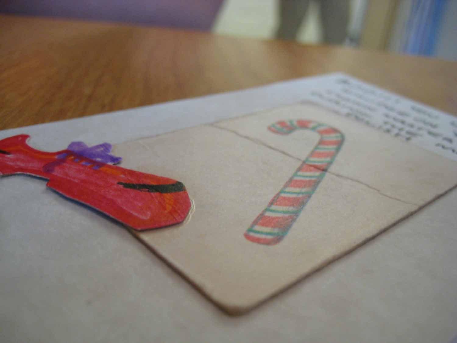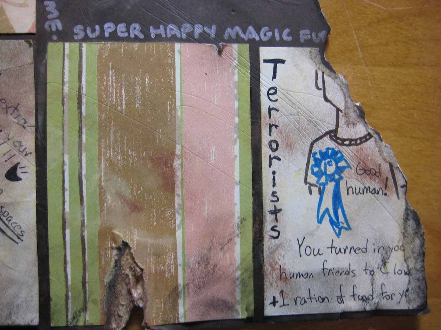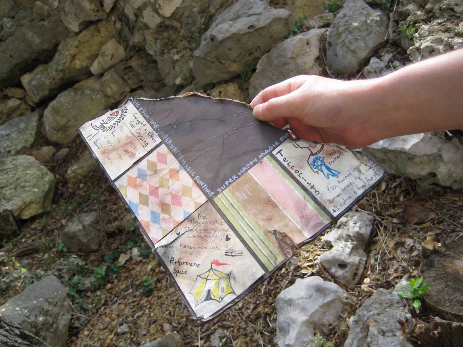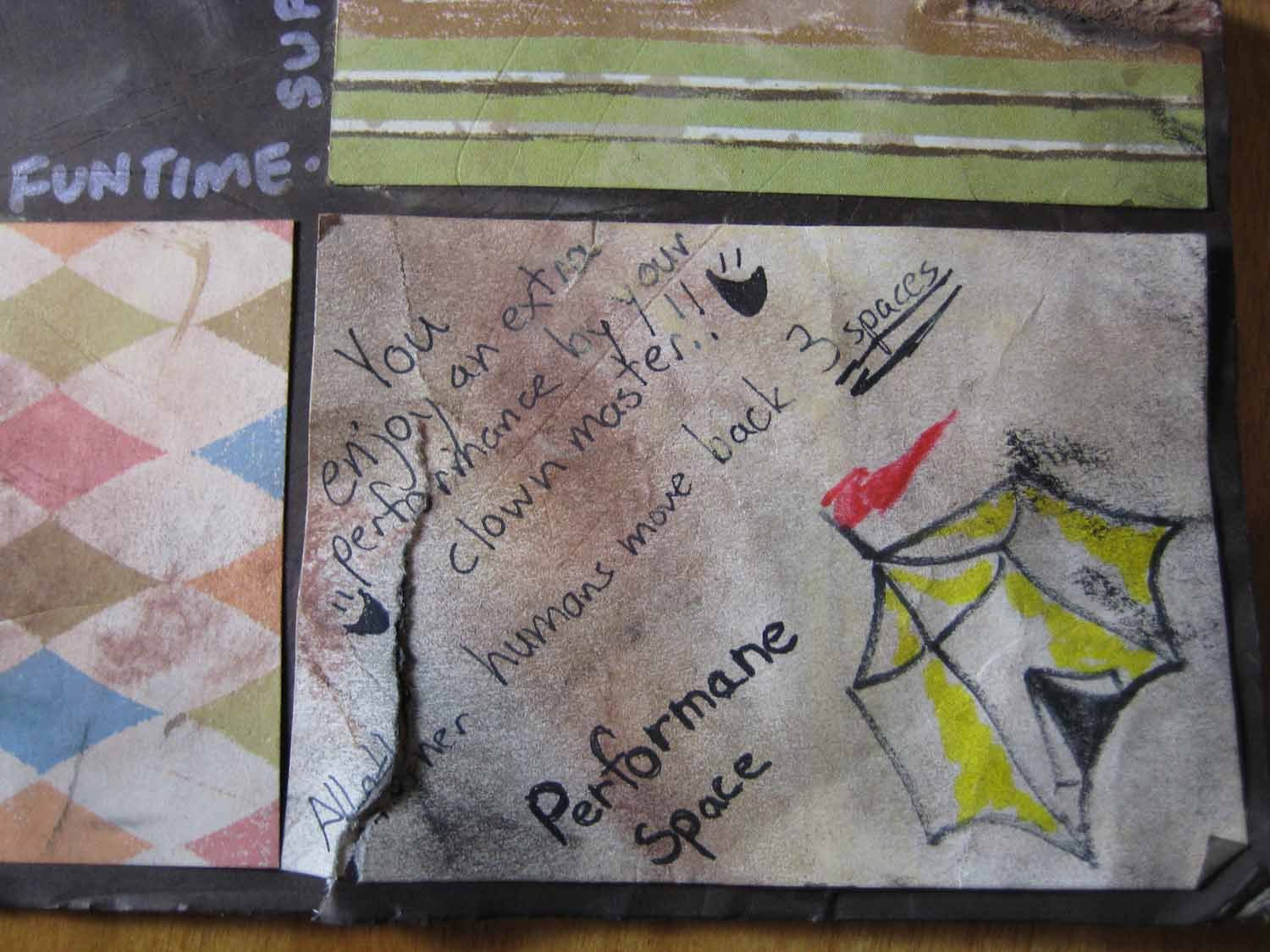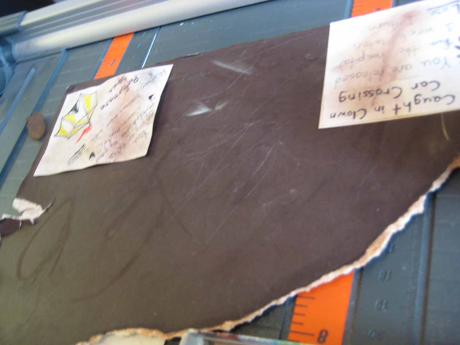 The board was made of a torn bit of cardboard, aged with oil pastels and chocolate: