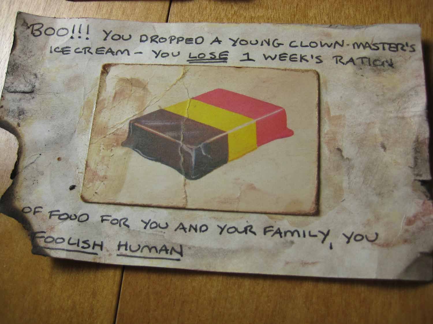 You dropped a young clown master's ice cream - you lose 1 week's ration of food for you and your family you foolish human