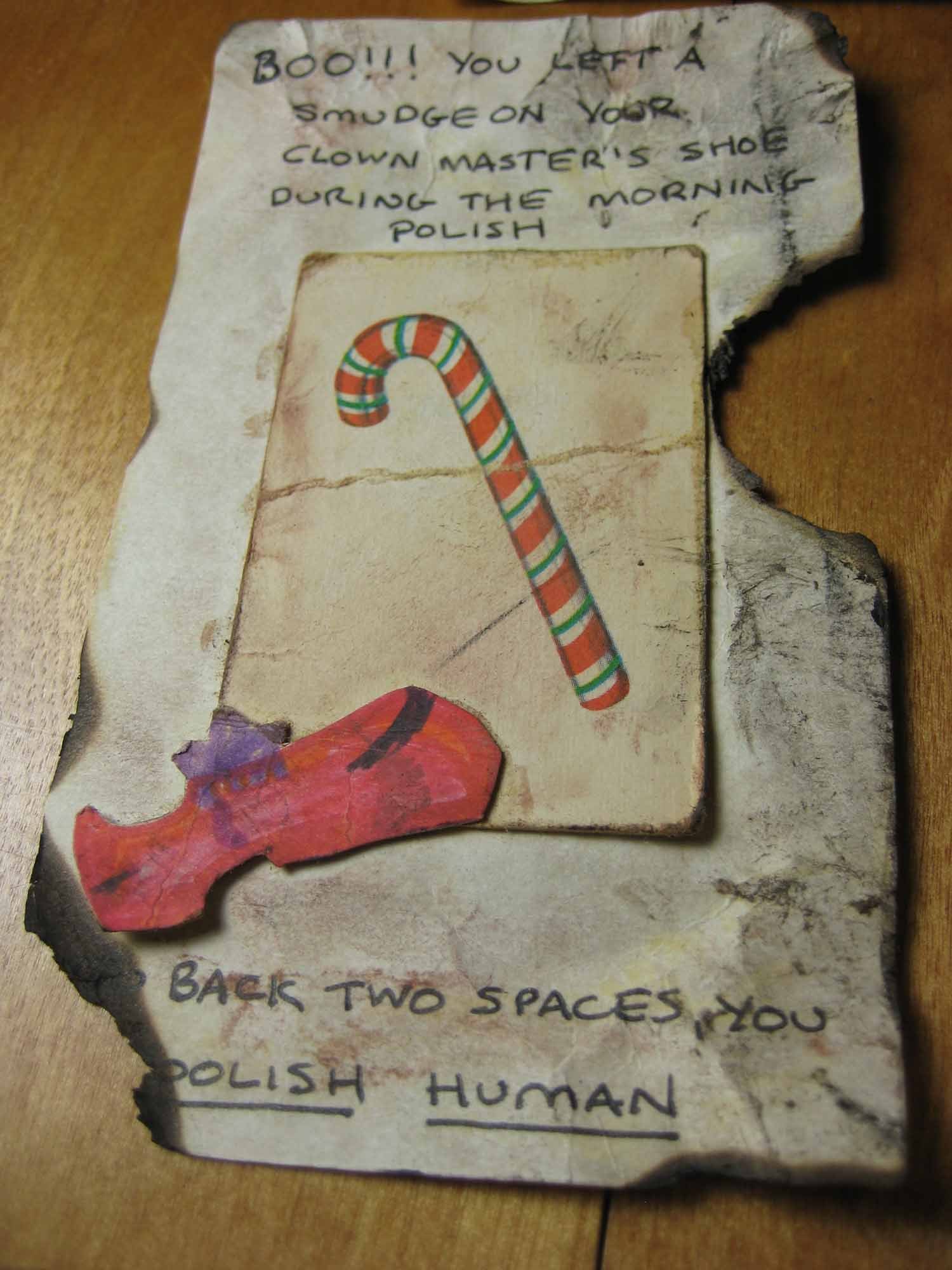 You left a smudge on your clown master's shoe during the morning polish [missing] back two spaces you foolish human.