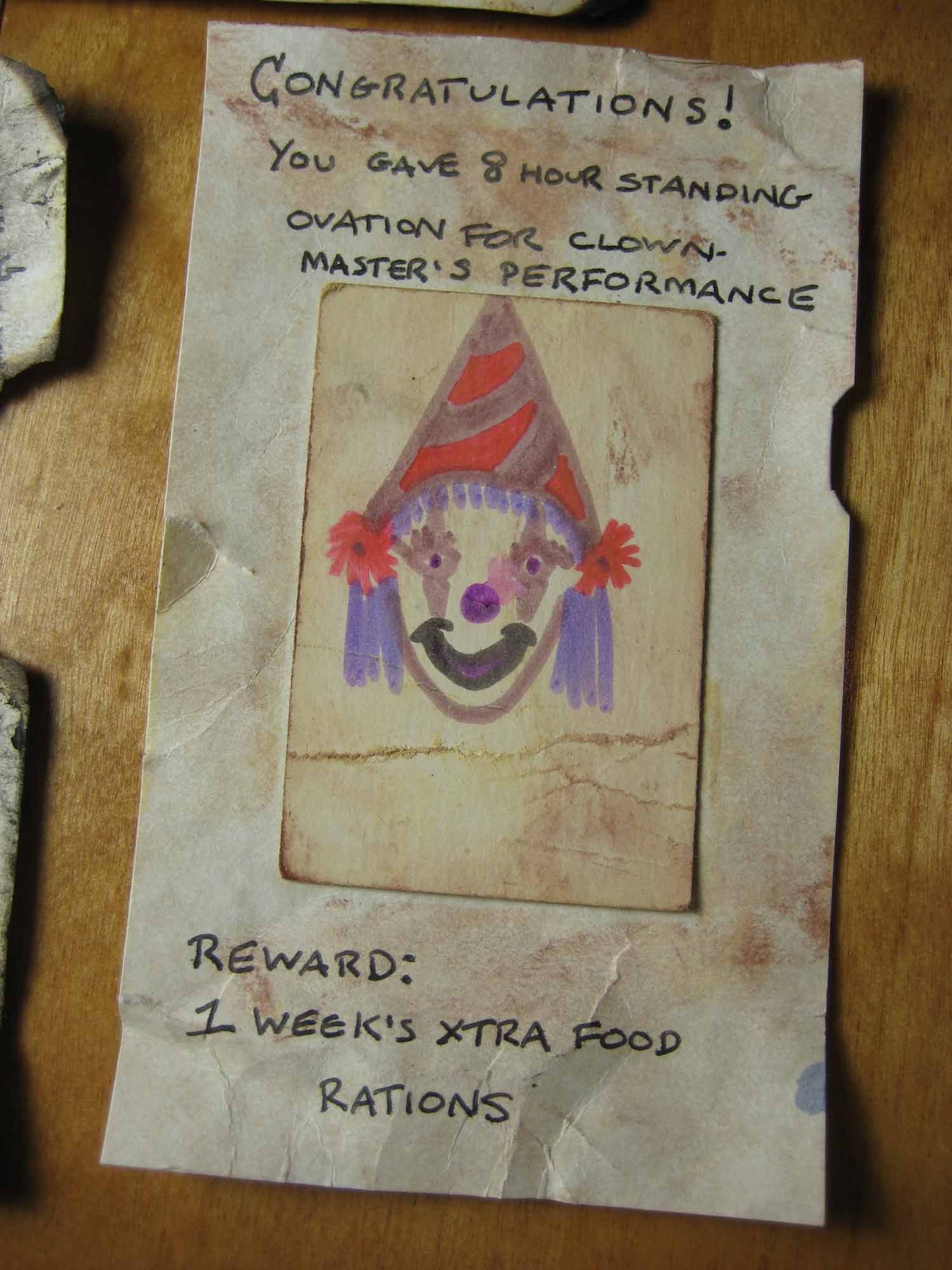 You gave 8 hour standing ovation for clown master's performance. Reward: 1 week's xtra food rations