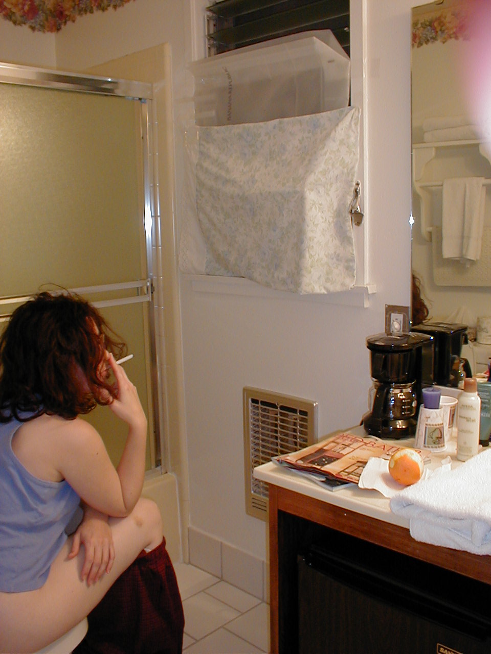 ok, i'm cheating (what, you've never?). this isn't actually a public restroom, it's the bathroom at a hotel/motel in carmel. the cigarette is actually a bat; the bruise is real. i just like the trashiness and pointlessness of this pic, so i'm posting it. SO THERE.