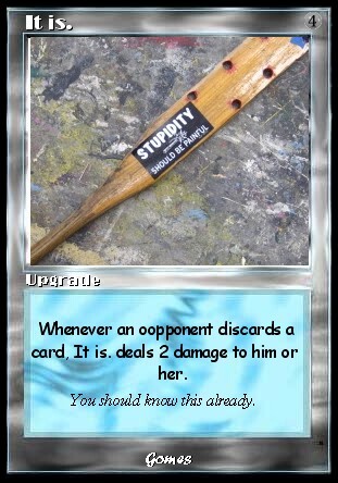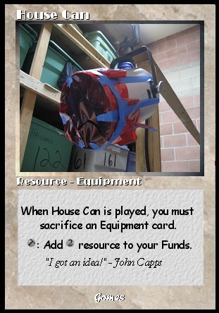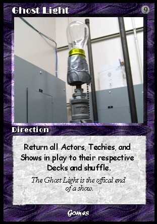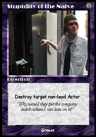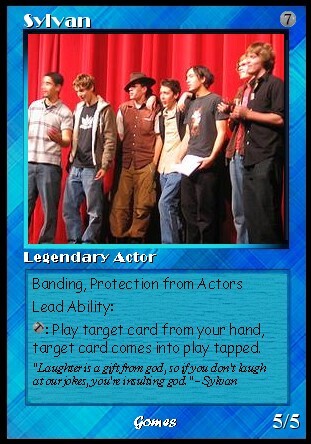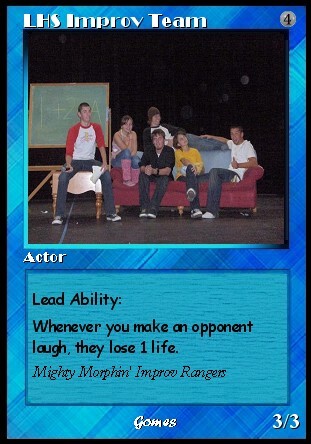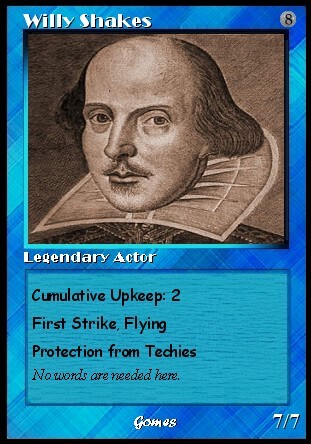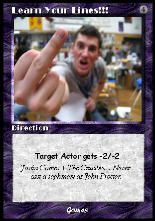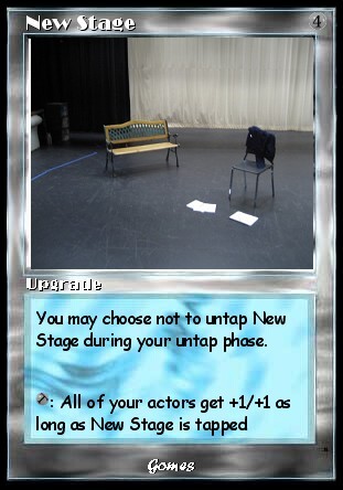Vote for home made Magic cards revolving around theatre. Oddly enough, my old Deck Manager and I made a whole deck of these featuring OUR techies and OUR theatre. MTG was a way of life. Major props.
