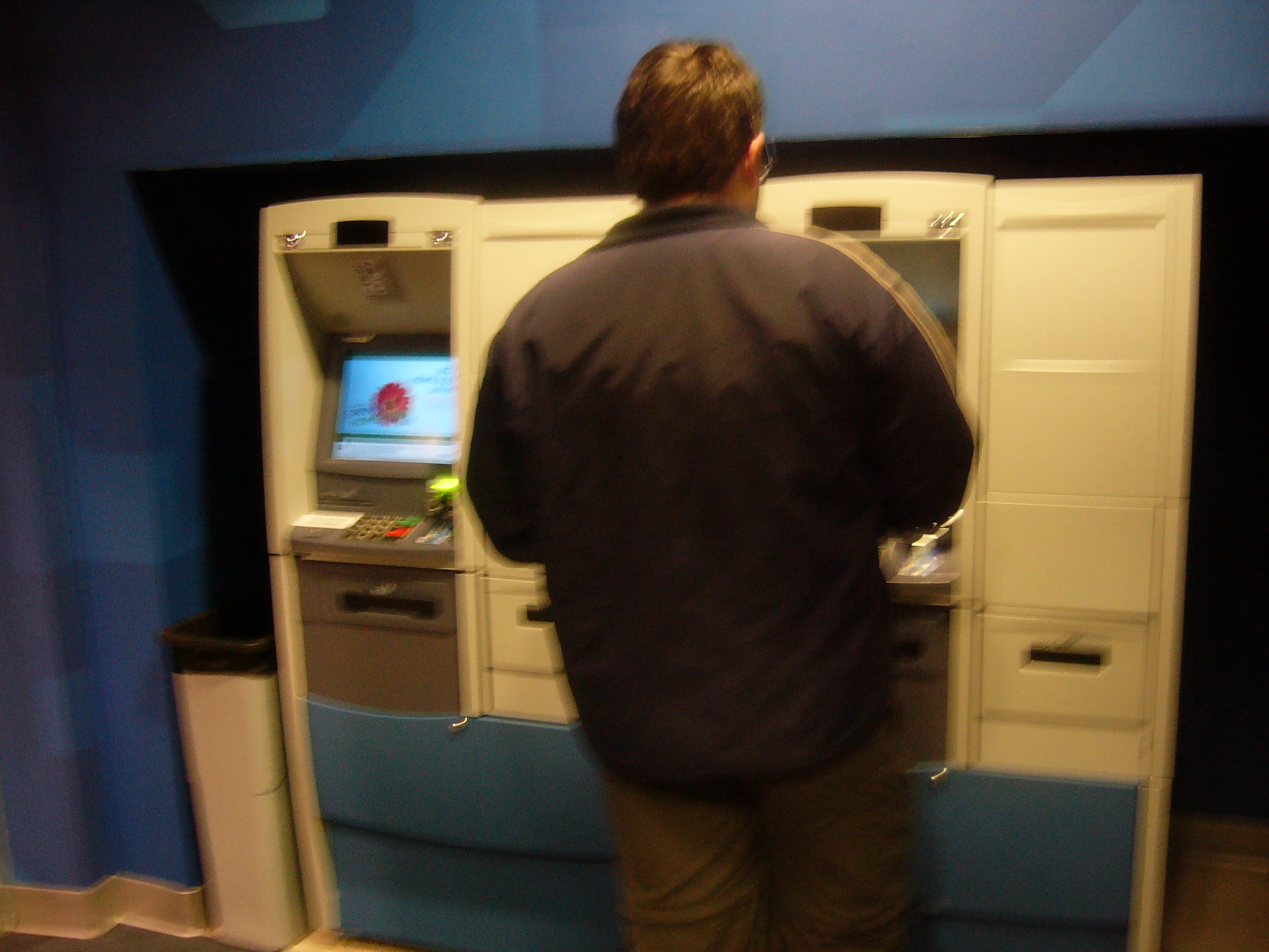 Munashii, inadvertantly finding a nice place for us to hide. Chase buildings require Chase ATM cards to open the doors after-hours.