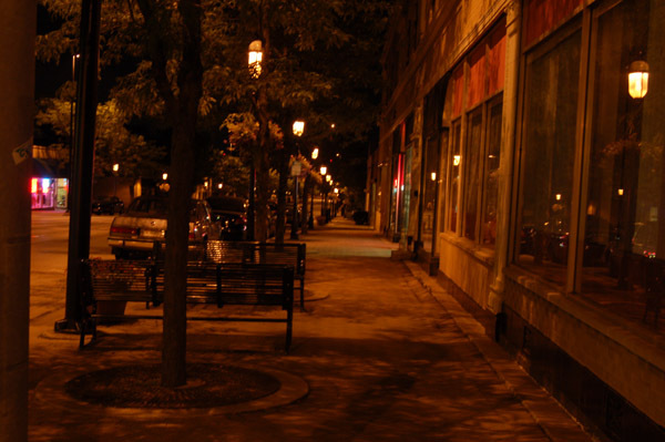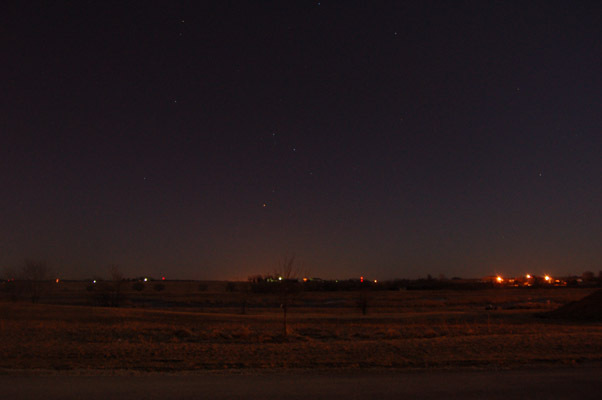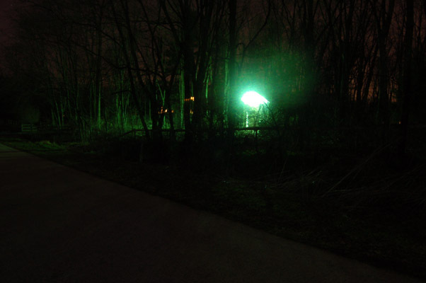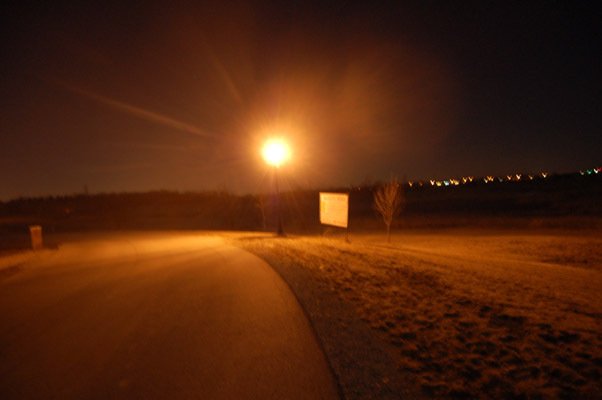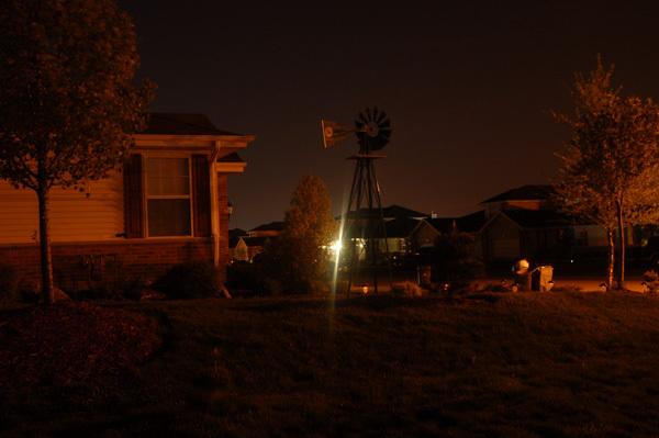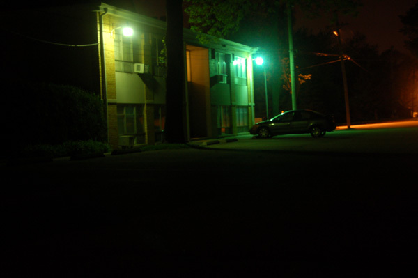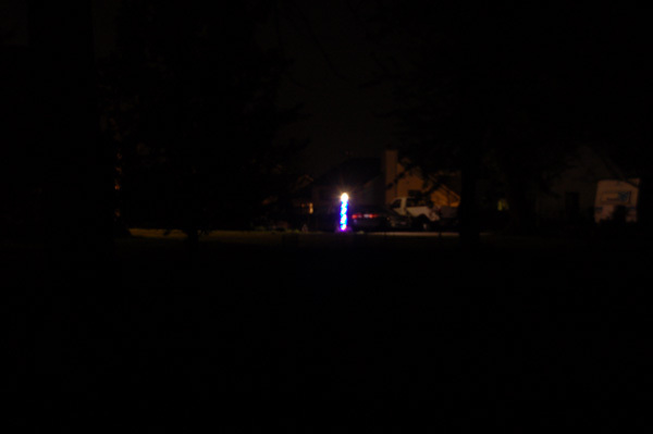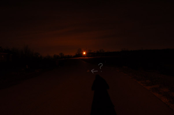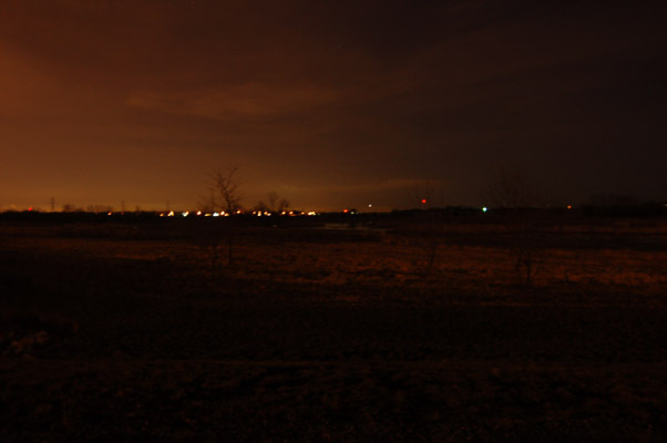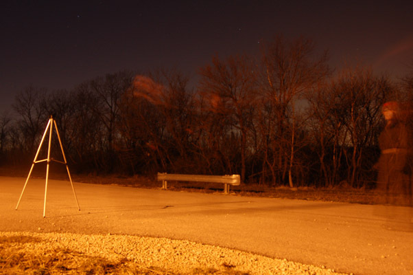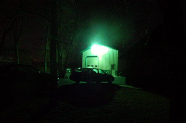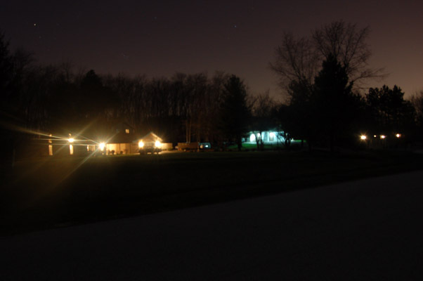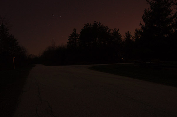 Well, I could be resourceful, and use the environment as a tripod. Yeah, that'll work! --..... No.... No it won't. I took a gander throughout the house to find something that could be used as a tripod, but for some reason, I didn't want to have to explain to cops why I was carrying a nice camera and a chair around my streets. So, I went outside with (only) my camera, and figured out how to get it to take long exposures. I think I would've figured it out faster had I tried to learn inside. Did I mention it was dark, and about 20 degrees?