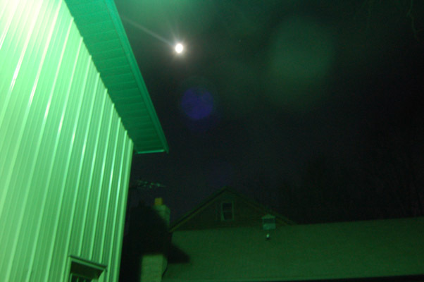 After some more camera-fudging, I found out that long exposures can be made into really long exposures when the " mark is by them (Derrr...). Reaching the end of my road, I took pictures of the guard-rail, which actually does have significance. It's been a witness to various cars parked at the dead-end here. Various cars with various owners with various intentions. It makes a good seat when going for a walk, as well. Figuring I was done with the first leg of Phase One, I looked for more subjects. Hmmm.... The moon's out..... :: snap; tries to hold still ::