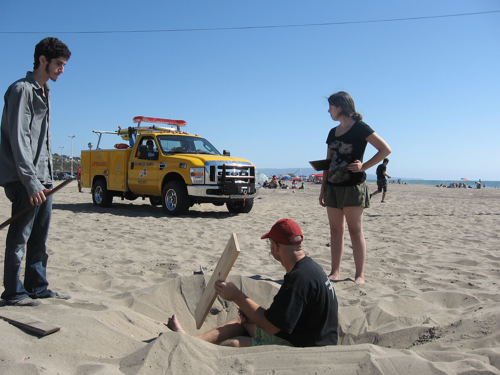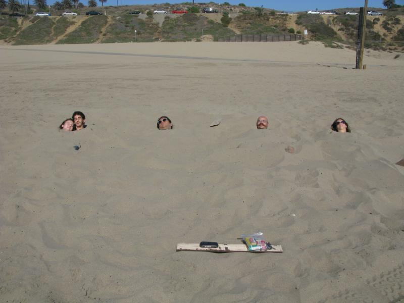 So the five of us sat buried in the sand. C.M. (who you'll remember was so afraid he would be too claustrophobic to withstand being buried) commented how nice and warm the sand felt as he was being buried, and actually managed to fall asleep shortly after being tucked in the cozy sand blanket. Teddy and Natalie were pinching each other and messing around the whole time, head-butting each other etc. Lincoln and the Walrus busied themselves with finding somebody to stop to take a photograph.