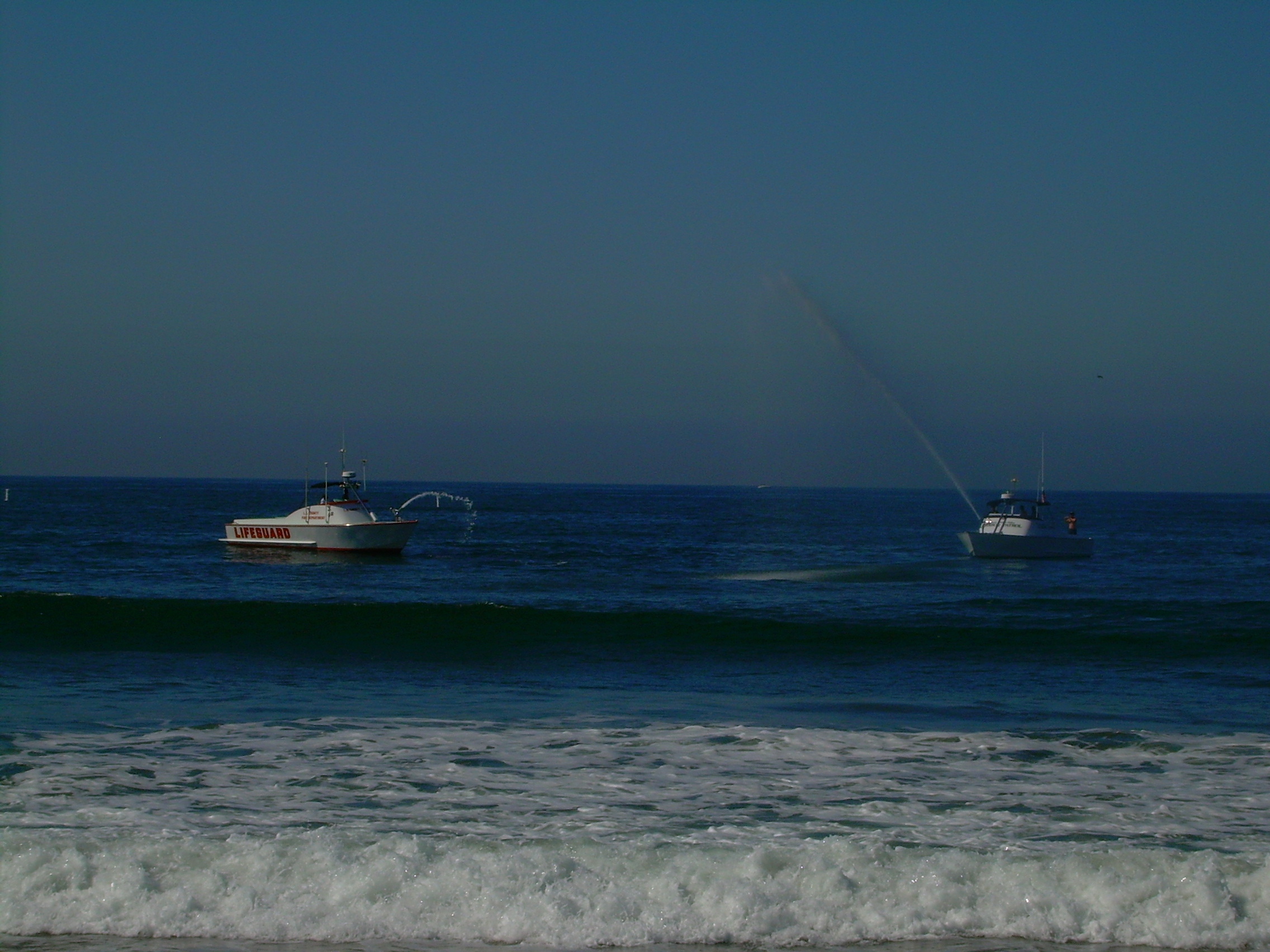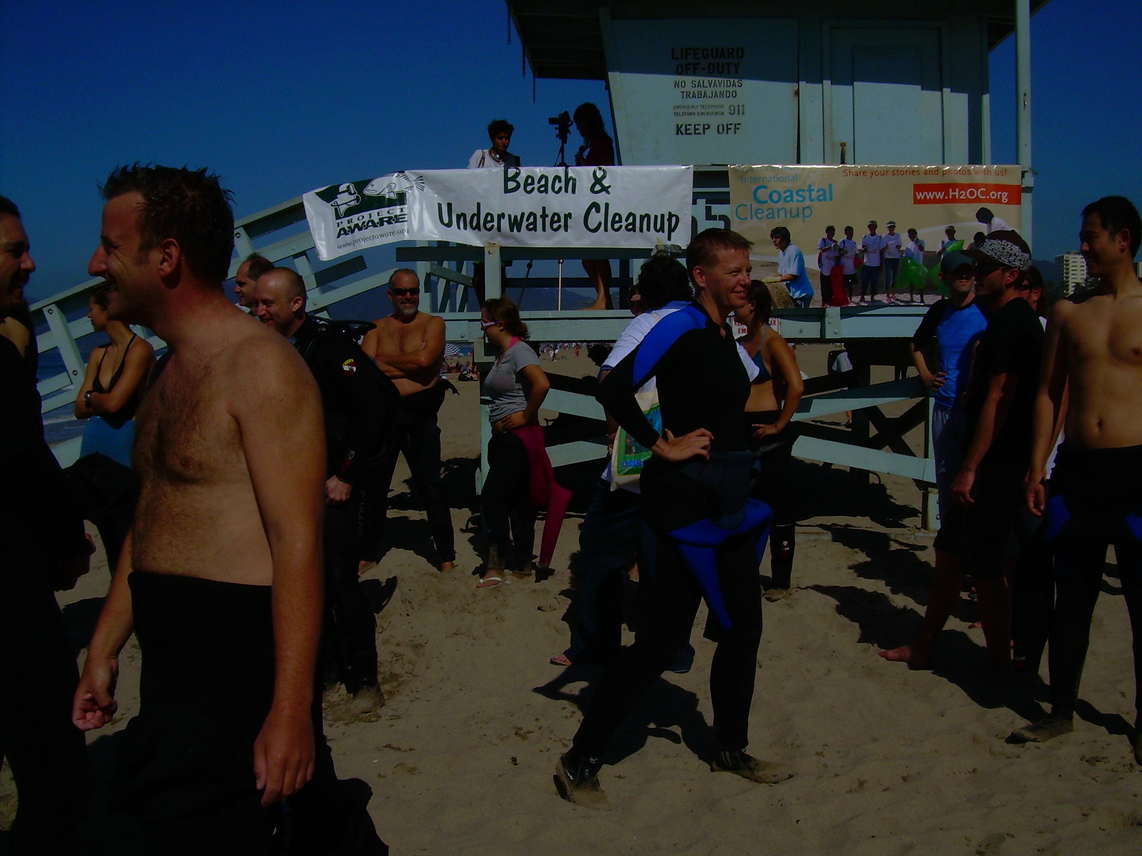 We surfaced and made our way through the surf zone. Surface support helped us out and started distributing sunscreen, water, and mysterious and inexplicable cocktail sausages. I made a beeline for the camera in my peacenik Volvo and snapped as many pictures as I could before the trash got taken away for categorization. I did get interviewed by a newsperson with outstretched mike, but it remains to be seen whether I will actually Make the News.
