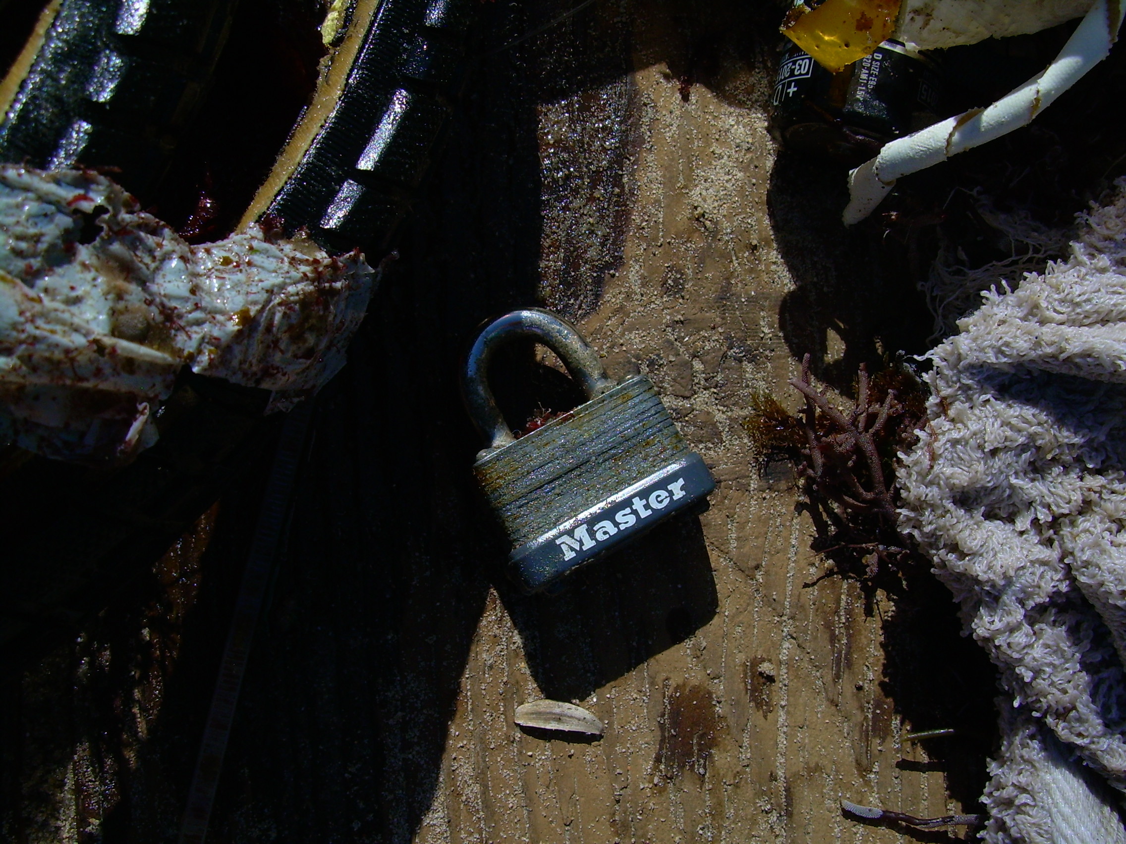 An old tyre, a Coke can, a Masterlock (obviously also a cargo cult, that, entrusting one's safety to the roaring waves), a bottle o' rum, and a puzzling purple thing.