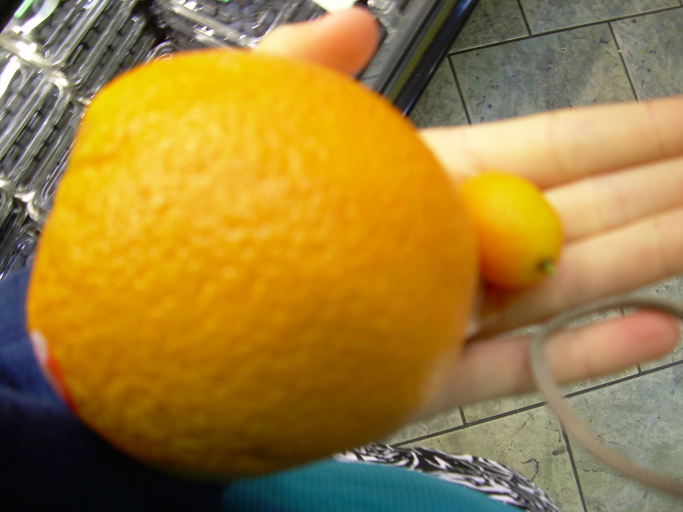 The Orange and the Kumquat went to sea/ in a beautiful pea-green boat. Yes, oranges and kumquats are different... but they're both orange citrus fruits. We decided not to quibble. The most fun part though, was that kumquats are $5.35 / pound, and we bought precisely 0.05 of a pound. Putting 26 cents of fruit through checkout turns more heads than cucumbers and Vaseline ever has.