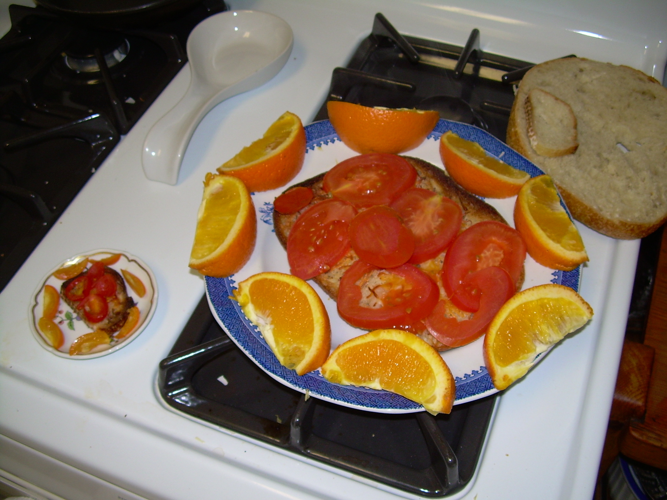 Our ocherous foodstuffs, having no place on a sandwich, were used merely to decorate each plate with a ring of 10X citruses.