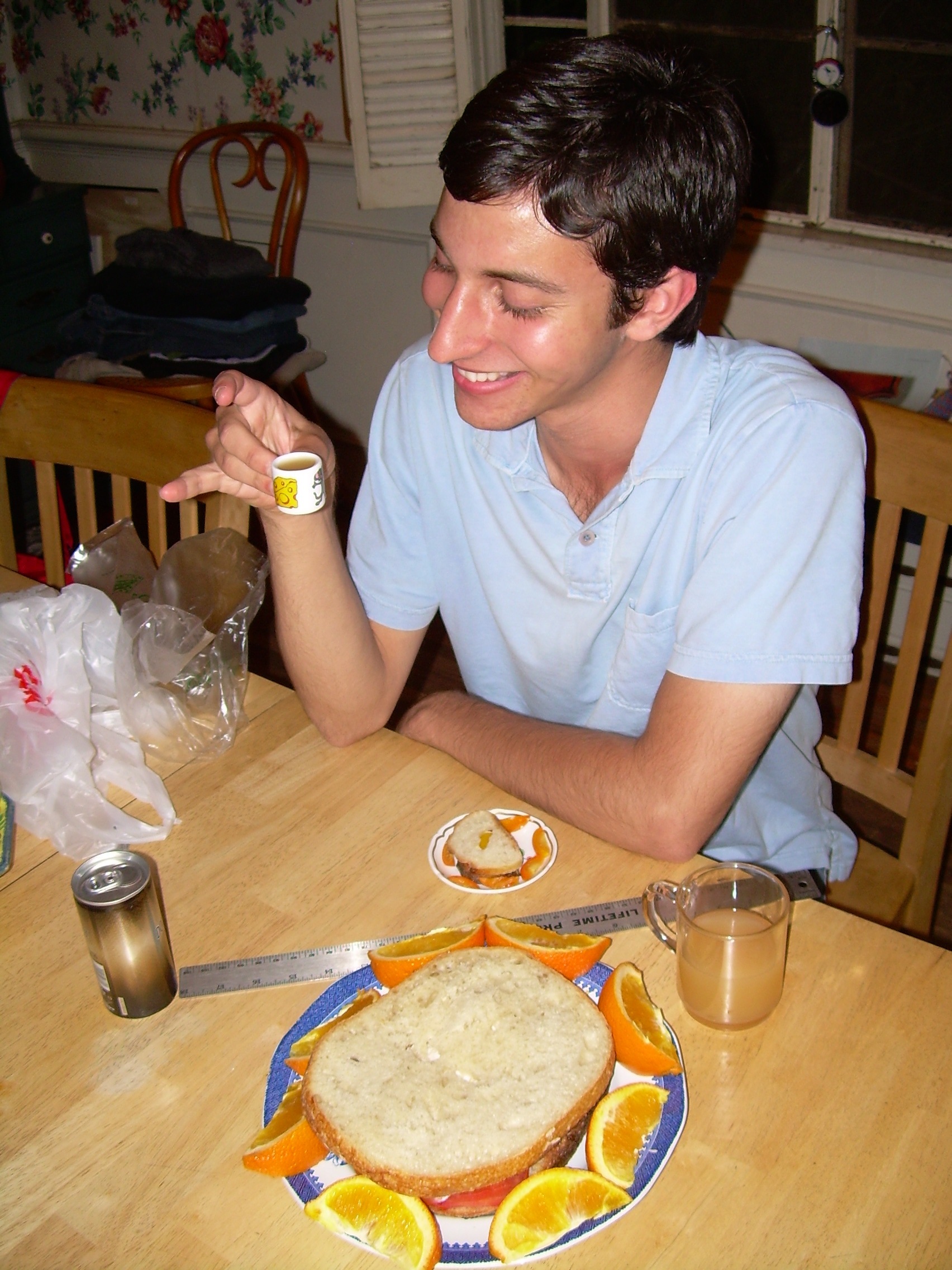 "Hope you enjoyed the cookies. Now make me a sandwich. -The Dormouse". It was on! Our original mischievous intent to give him a sandwich with a response note gently nestled within became a quest to give to him a sandwich unlike none he had tasted before. Just as rapidly, the plan to deliver a pastrami sandwich on raisin bread with cottage cheese drove us to a different oddity of ingredients. We would make a sandwich alright, but one scaled down for the Dormouse. While we were at it, we ought to make a normal sized sandwich for the guy who lives at the Dormouse's address.