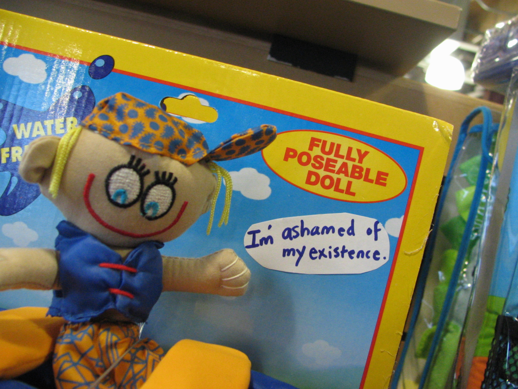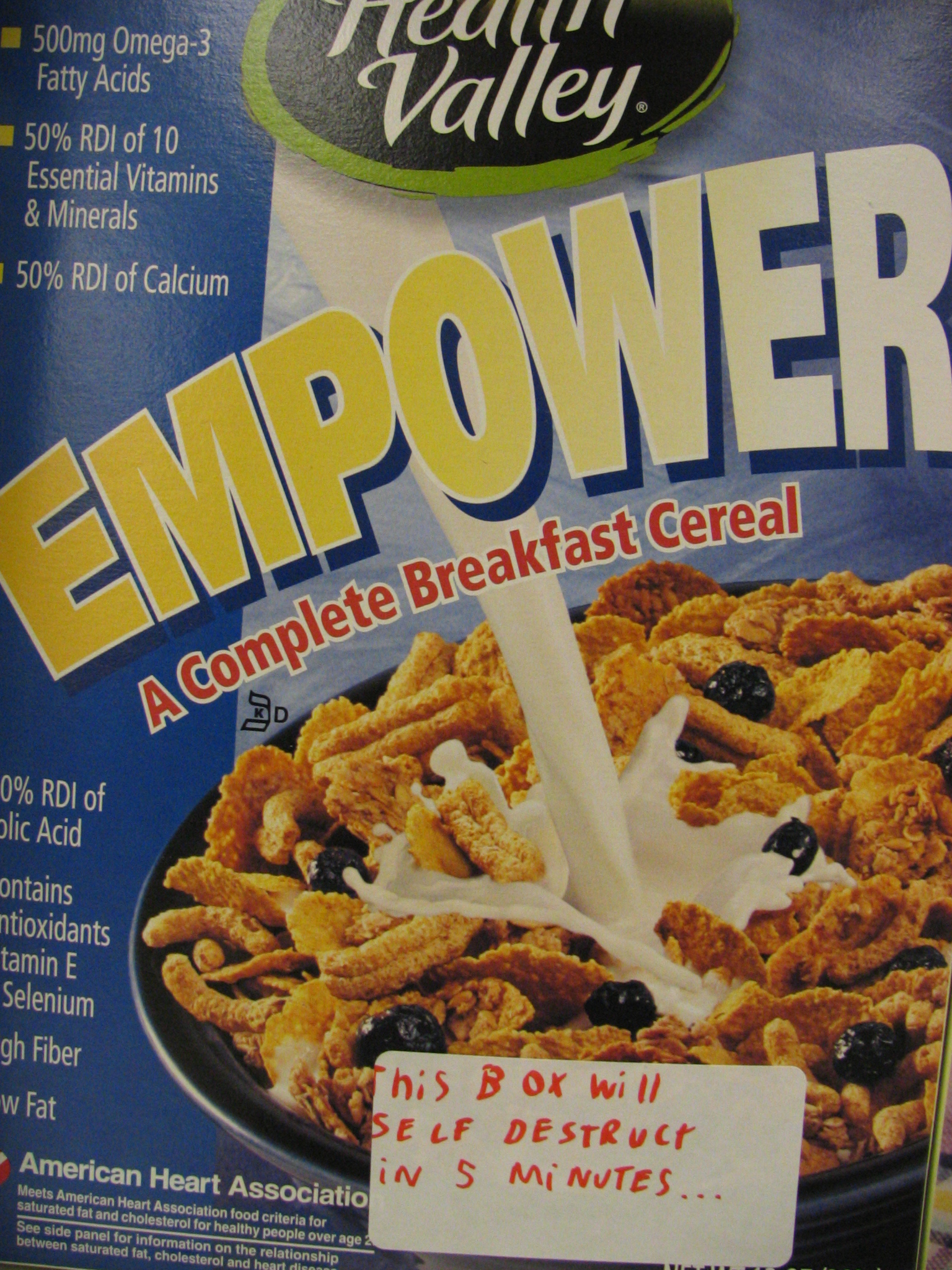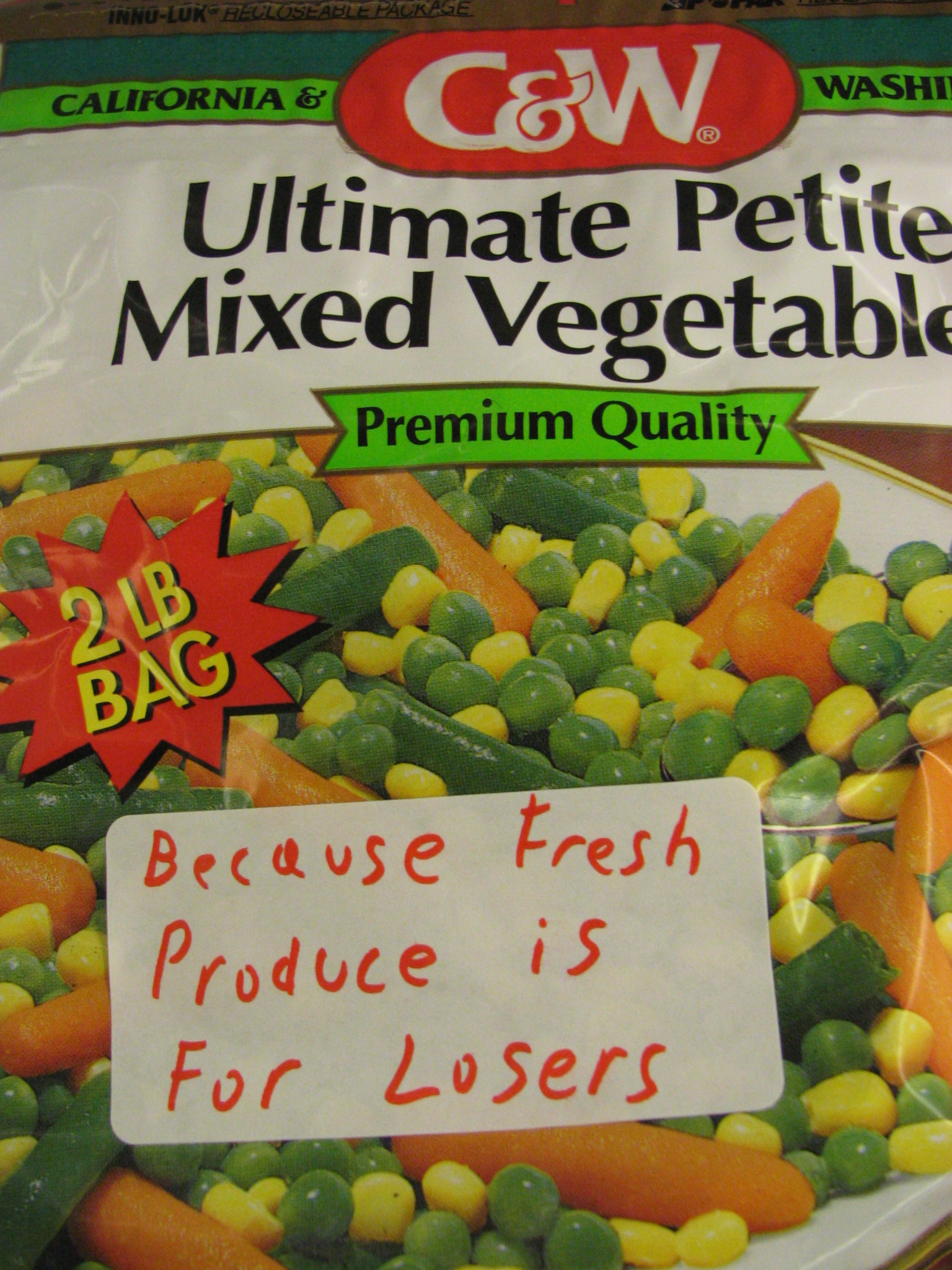 I wrote, applied and photographed all of these in busy isles with people everywhere, most were slogging along in zombie mode or just couldn't care to notice or notice to care. Once I even had a women reach in through my arms to grab some cereal, she didn't have a care about what I was up to. So much for my sales strategy!