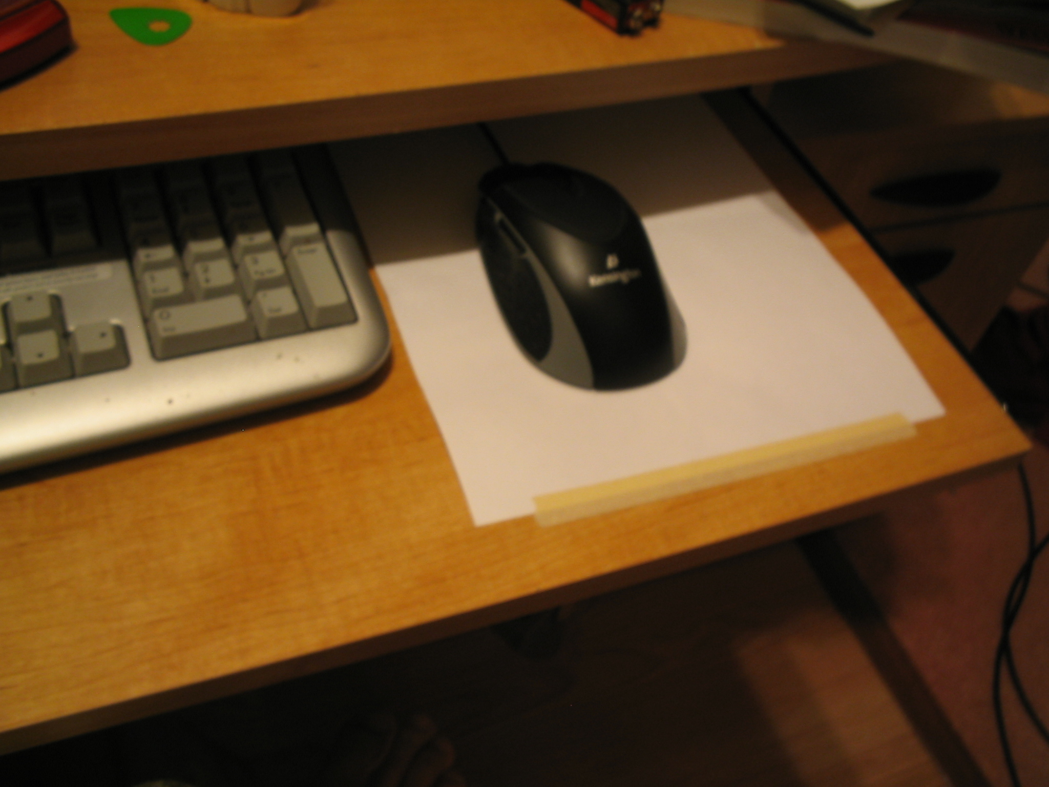 The second photo is of my ghetto mouse pad. I use an optical mouse, and my desk is too glossy for the mouse to work properly without something under it. I'm too cheap to buy a real mouse pad, so I make do with a piece of paper taped to my desk with masking paper.