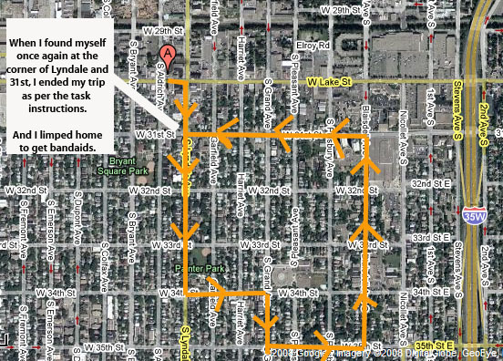 I started out my front door, at Aldrich Ave and Lake Street. I flipped a coin and it declared that I should head east to start. I walked east up Lake Street and the first stoplight I encountered (Lyndale Ave) forced me to turn. I took a right to cross the street and walked south on Lyndale Avenue.